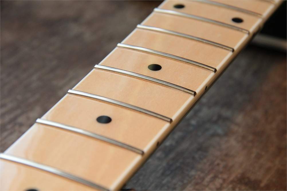 Вчера, меняя струны и отстраивая гитару, заметил одну вещь. третья струна звенит. Все отстроил под себя, мензуру, прогиб, высоту струн над ладами, как делаю на всех своих гитарах (примерно от 1,5 мм у 1-й и до 2 мм у 6-й). На открытых струнах все идеально. А вот как на ладах зажимаешь, 3-я позвякивает равномерно от 1 лада. Гриф в идеале сейчас. Поэтому возникли подозрения, что дело не в нем. А в седлах. У них есть ход, и иногда они друг о друга ситарят. Поправишь пальцем чуть-чуть, все нормально становится. Позвонил сегодня Максиму (Shade). Он мне те же подозрения озвучил.