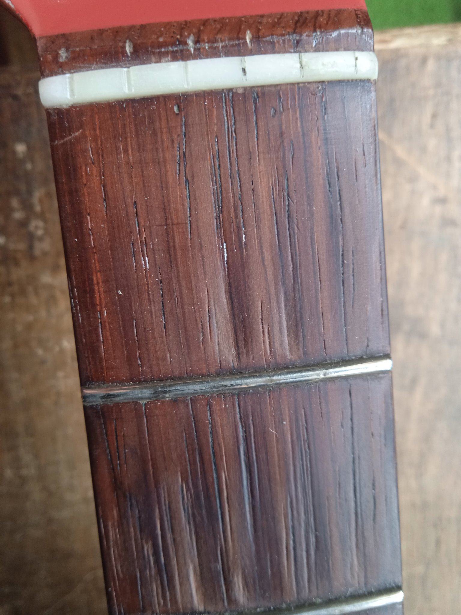 на любом (!) палисандре, если очень много играть с низкими ладами, когда пальцы и когти трутся по накладке, естественным образом образуются ямки в накладке..