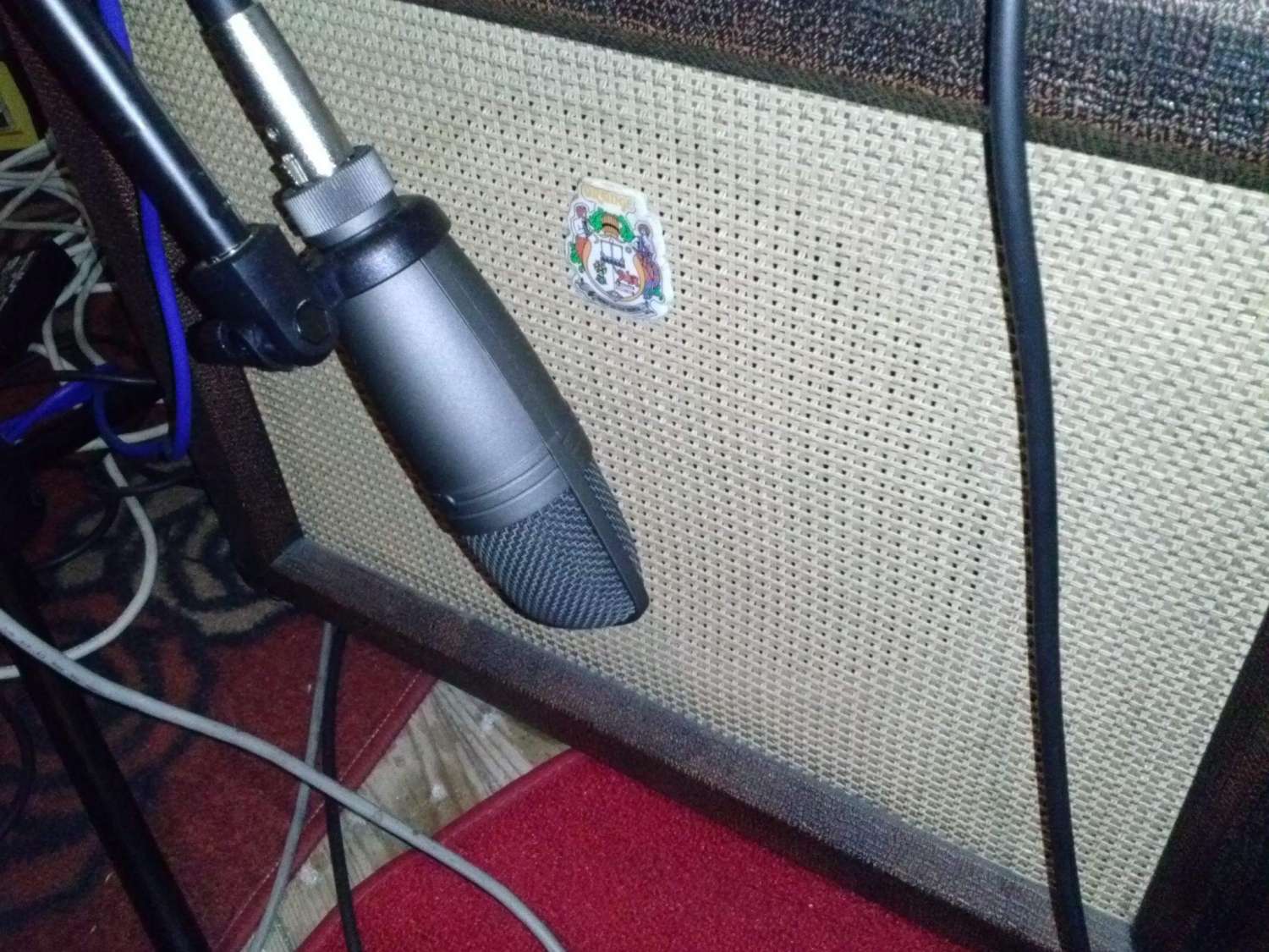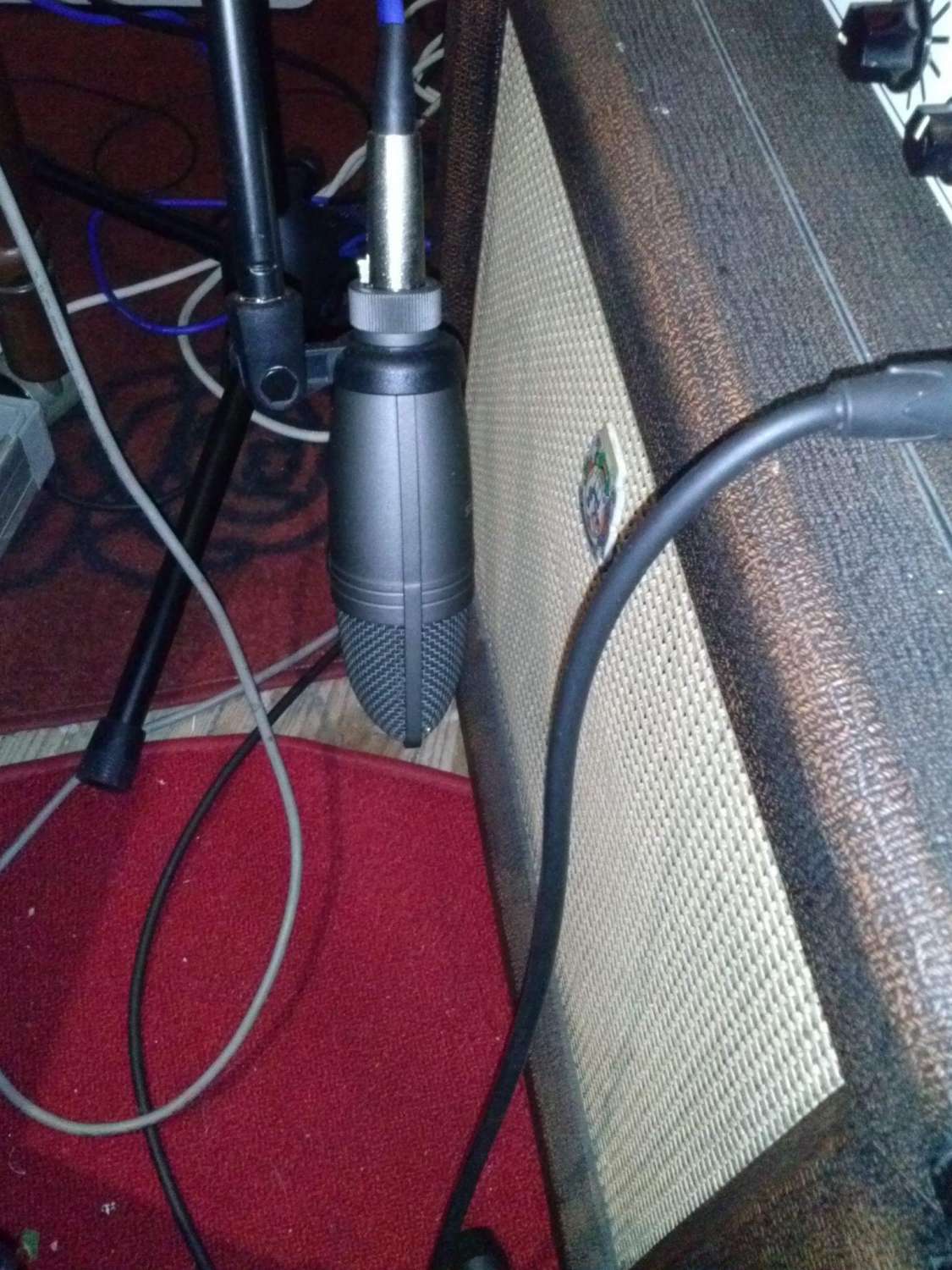 Перед тем как располагать микрофон, советую одеть наушники AKG 240 (мониторы), это вам поможет найти нужную точку для расположения микрофона, другие обычные наушники будут преукрашивать звук по-своему. Для ясности звуковой картины нужен адекватный мониторинг, если стоит задача снять микрофоном именно тот звук, который вы слышите, находясь рядом с комбиком. Для этого совершенно не обязательно делать гитарный усилитель громко на тот момент, пока идёт настройка. Звук с гитарного усилителя не должен проникать в наушники при отстройке микрофона. Если у вас Shure 57, то не стоит ставить его в центр динамика, микрофон рекомендую расположить ближе к краю динамика, так как мембрана имеет конусообразную форму. Нам нужно стараться ставить капсуль микрофона перпендикулярно мембране, а для этого микрофон следует повернуть на 20 градусов ниже центра и рабочая точка для снятия звука будет находится в 8 см от края динамика (динамик 12 дюймов), если вы снимаете звук только одним микрофоном, то можно добиться более или менее похожего на оригинал звучания. Чтобы полностью отразить все звуковые процессы, то одного микрофона мало, так как сложно направленным микрофоном снять звук со всей площади динамика, тем более, если динамик 12 дюймов (это гораздо больше чем рот певуна). Для достижения лучших результатов хорошо иметь в запасе ещё один конденсаторный микрофон типа Neumann U87 или Audiotechnica 4033, 4041 (можно пробовать и другие модели), но не стоит забывать, что у конденсаторных микрофонов высокая чувствительность, что создаёт дополнительные сложности при их использовании на экстремальной громкости. Так что громкостью придёться немного пожертвовать ради звука.