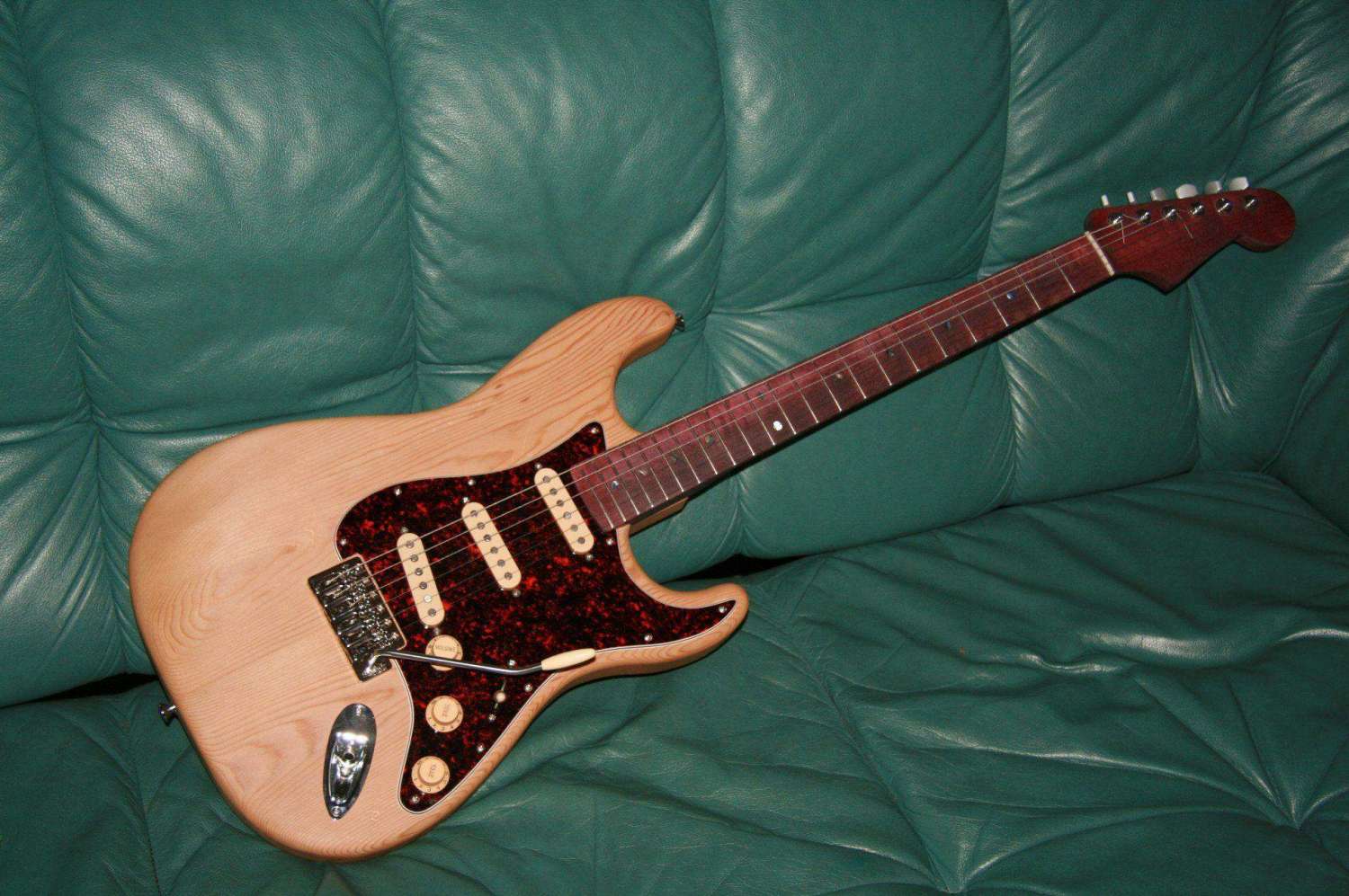 Внизу самый мой безумный страт. Собран из частей, в основном от Musikraft. Корпус - из канадской тсуги (hemlock), разновидность сосны. Дерево просушено, поскольку дека была изготовлена из балки, которая была частью разбираемого древнего дровяного склада. За последние более чем двести лет древесина хорошо просушилась ))))