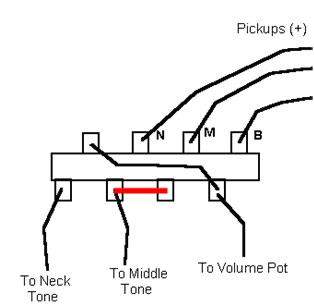 вот такую перемычку впаяй .... и добавил:Или просто провод перекинь на соседнюю пустую клемму но тогда средний датчик отдельно тоном регулироваться не будет.... и добавил:Ещё в этом случае там провод тона мидл и нек надо местами поменять на клеммах переключателя. Если в принципе тон среднего датчика не принципиален то надо в родной схеме всего лишь провод с тона среднего датчика перекинуть на свободную клемму.