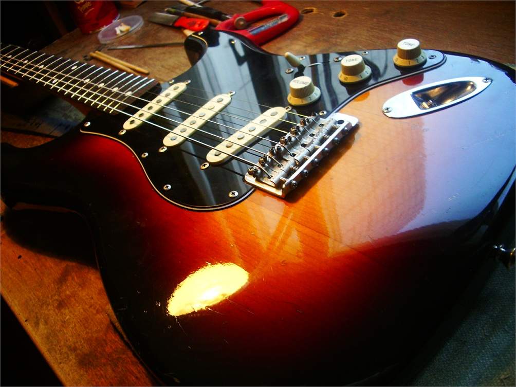 значица так. Это не мастеровая гитара - это сборная солянка из китайских запчастей, которые в огромных количествах содержатся в наборах "собери-сам", продаются повсеместно в магазинах с продукцией китайского гитарпрома. Видно по колкам, звучки керамические самые дешевенькие, корпус и гриф китайские - всё без проблем через тырнет заказывается недорого. Гриф более менее, корпус наверняка действительно липа- самый дешевый из приличных (если это действительно кусок дерева под краской скрывается). Фурнитура тоже соответствующего уровня- силуминовая имитация нормалнього металла - для обучения хватит, но не более того. С Музимой, которую ты загнал в обмен - никагого исравнения. Это всётаки раритетная полуакустика, котороая и ценится уже соответственно. (правда не всеми, а специальными фанатами этого дела ).Само по себе для начального уровня это нормально. Но на мастеровой страт никак не тянет.... и добавил:типа такого.http://www.ebay.com/itm/New-Maple-Neck-Fingerboard-Fretboard-22-Fret-For-Stratocaster-Electric-Guitar-/400641685125?pt=Guitar_Accessories&hash=item5d481af685и такого http://www.ebay.com/itm/SSH-HSS-Alder-Replacement-Body-for-Strat-Guitar-Sonic-Blue-Lefty-Left-Handed-/151270412130?pt=Guitar_Accessories&hash=item23386b4f62или вообще вот так: http://www.ebay.com/itm/DIY-Strat-Stratocaster-Style-Electric-Guitar-Kit-BUILD-YOUR-OWN-STRAT-/141120173604?pt=UK_Musical_Instruments_Guitars_CV&hash=item20db6af624... и добавил:т.е у частие мастера в этом страте заключалось максимум в покраске и сборке китайскирх комсплектующих .Общей сумимой тыщ на 3-5 не более.... и добавил:вот она, тремола силуминовая: http://www.ebay.com/itm/TREMOLO-BRIDGE-CHROME-TREM-NEW-FOR-FENDER-STRAT-GUITAR-/230566340813?pt=AU_Instrument_Accessories&hash=item35aed328cdколке:http://www.ebay.com/itm/6-Guitar-String-Tuning-Pegs-Keys-Tuners-Machine-Heads-/190710247047?pt=Guitar_Accessories&hash=item2c67376e87и наконец, вершина звука: http://www.ebay.com/itm/Set-of-3-pcs-Single-Coil-Pickup-SSS-for-Strat-Style-Guitar-White-Color-/161274124144?pt=Guitar_Accessories&hash=item258cafd770... и добавил:Alexander Kenway, а вот как люди от музим "съежжают":http://sovietguitars.com/e107_plugins/content/content.php?content.115а вот тебе цена приблизительная:http://www.avito.ru/belgorod/muzykalnye_instrumenty/prodam_musima_record_313268614... и добавил:а звучать твой стратокастер будет как китайский липовый страт. Примерно.