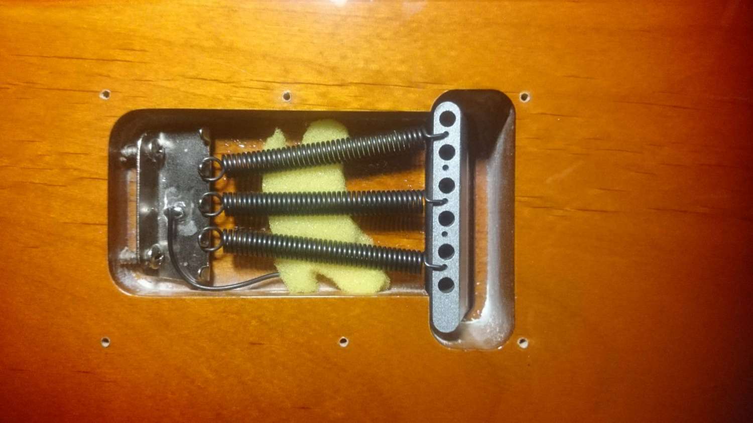 1. Предыдущий владелец тремоло не пользовался, поэтому даже отверстие для рукояти было заклеено наклеечкой в цвет бриджа. Однако же стоило мне отстроить гитару (как учили, бридж параллельно деке) и вставить рукоятку, как я обнаружил это: