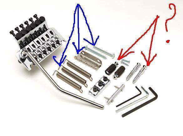 Что меня интересует выделено красным цветом.У меня есть ESP, там флойд крепится на двух больших саморезах,которые вкручиваются в само дерево.А есть гитара,где стоит нелицензионный флойд с конструктивным закосом под шаллер.Но по размеру встанет и ОФР.Так вот там втулки в самой деке гитары с резьбой,куда вставляются два болта с резьбой.Вопрос собственно в том,что идет в комплекте с ОФР, и какого размера там эти болты( если они там есть),чтобы не ковырять у себя в гитаре...