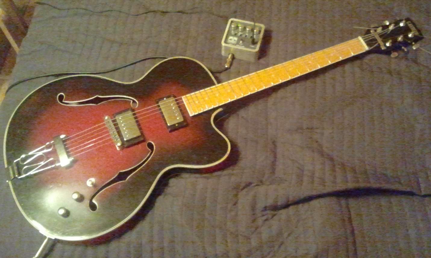 Короче конструктор, боди Музима, гриф Грейч, в неке Сет Ловерс,в бридже кореец пафовый.Звучит замечательно, надо только струны потольше.