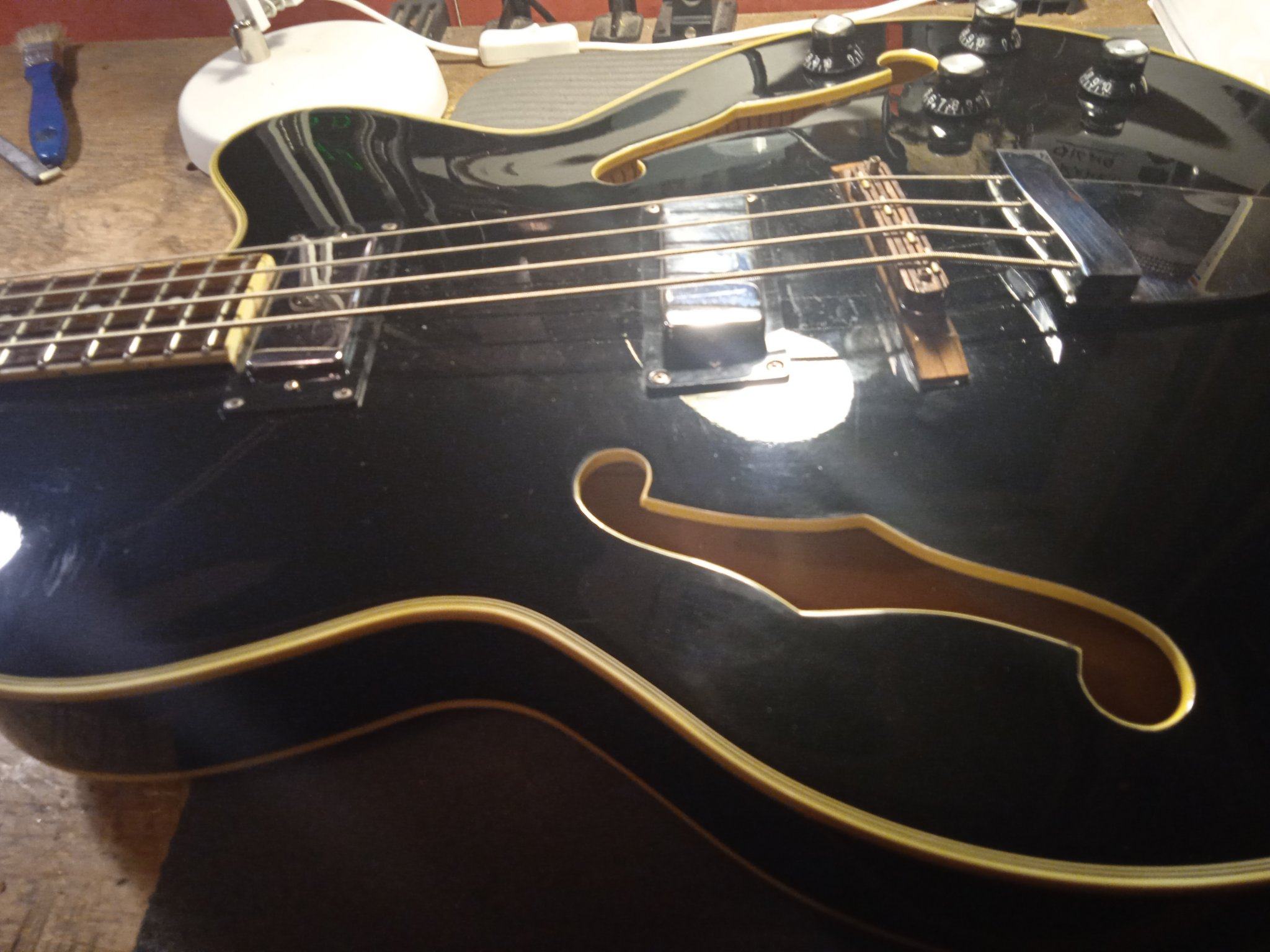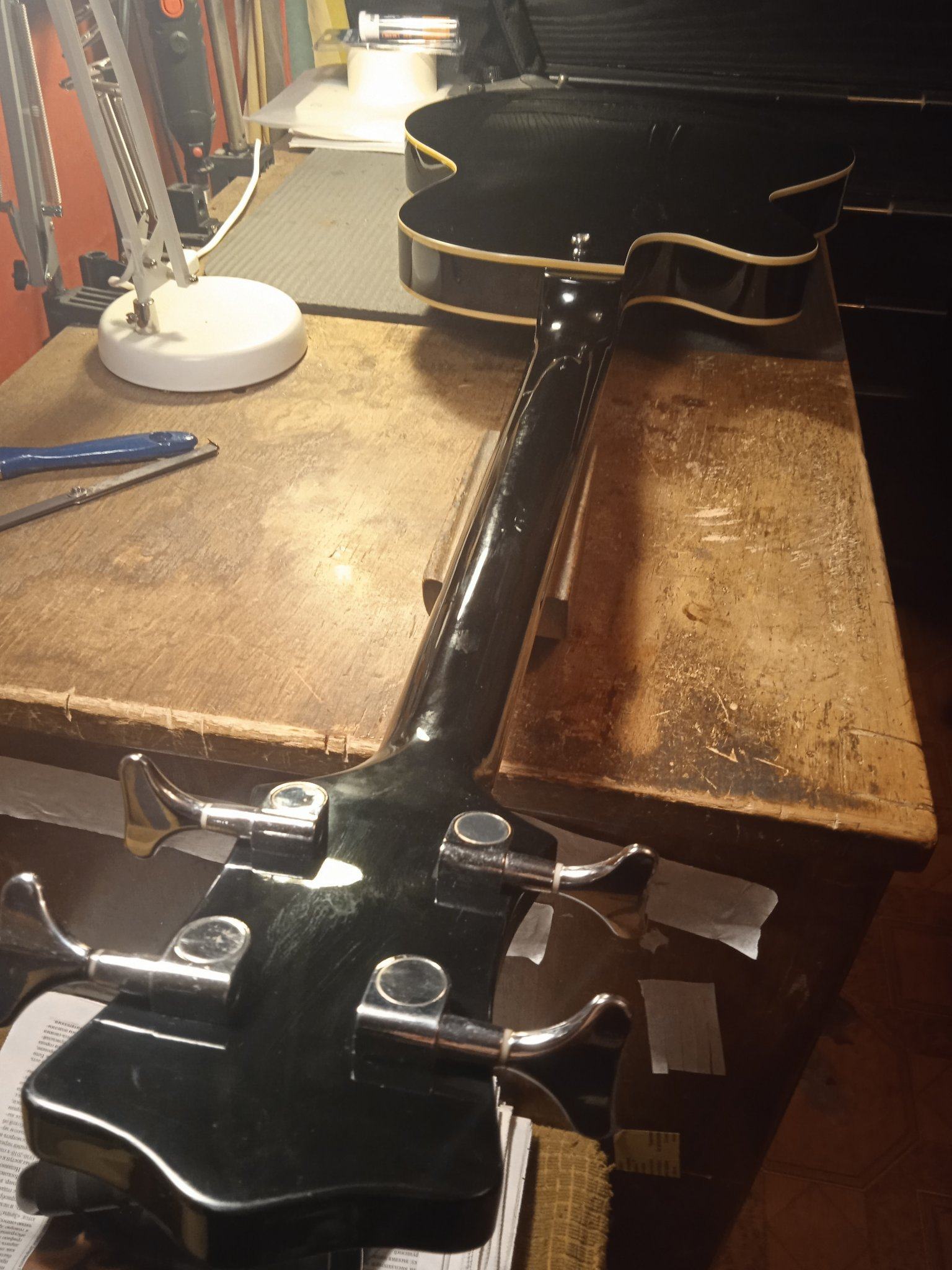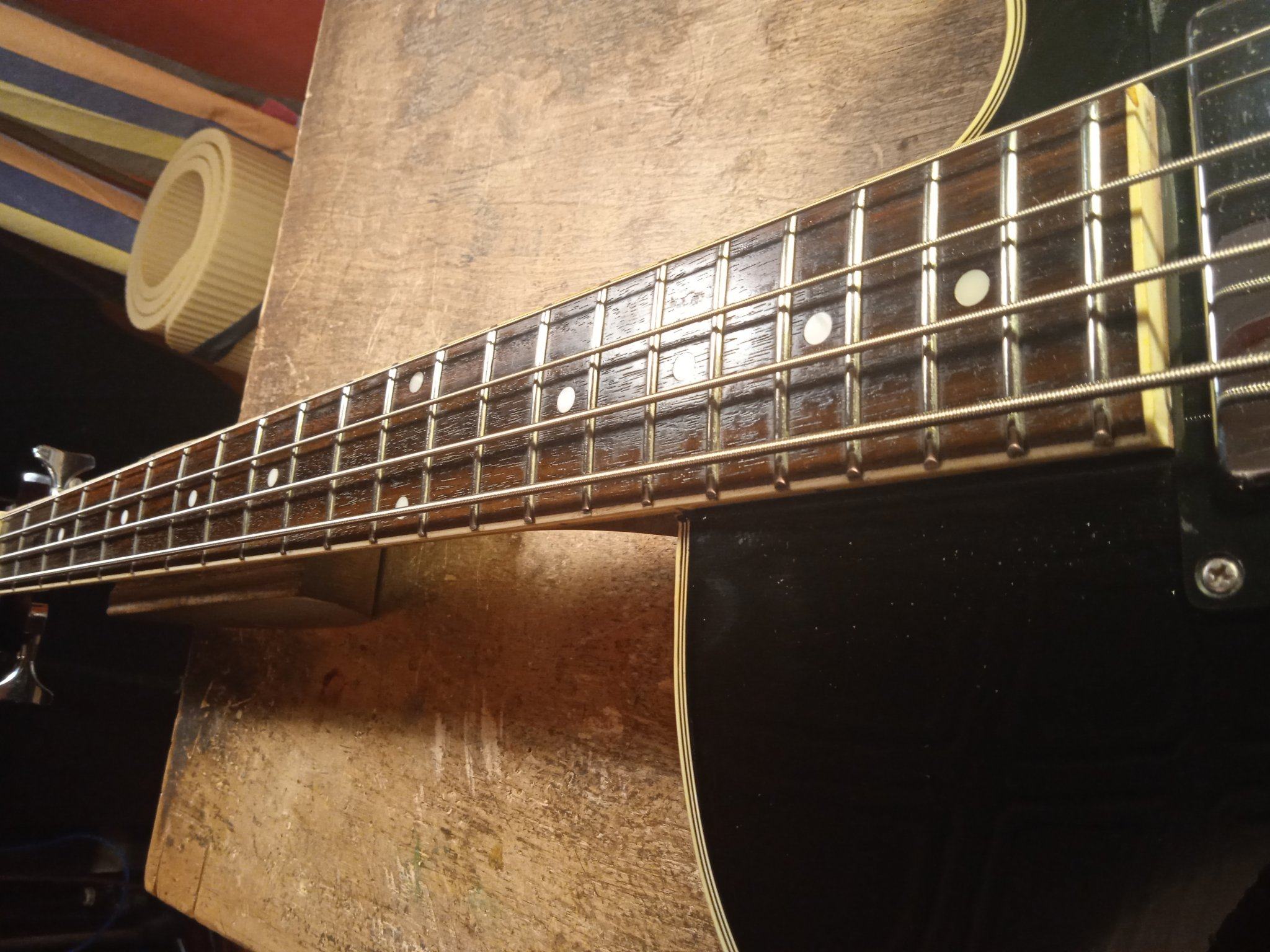 И слой надо потоньше. Это как раз - поставить порог на место, прижать аж опупевши, и капнуть , можно с одной стороны, супера. Он затечёт по неровностям, но не испортит прямого контакта порога с грифом, где прижалось хорошо... Можно по приклейке сразу капнуть раствором соды. кое-где супер вспучится и заполнит оставшиеся пустоты