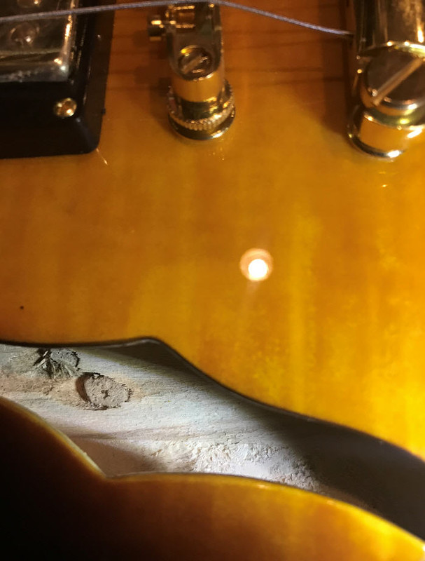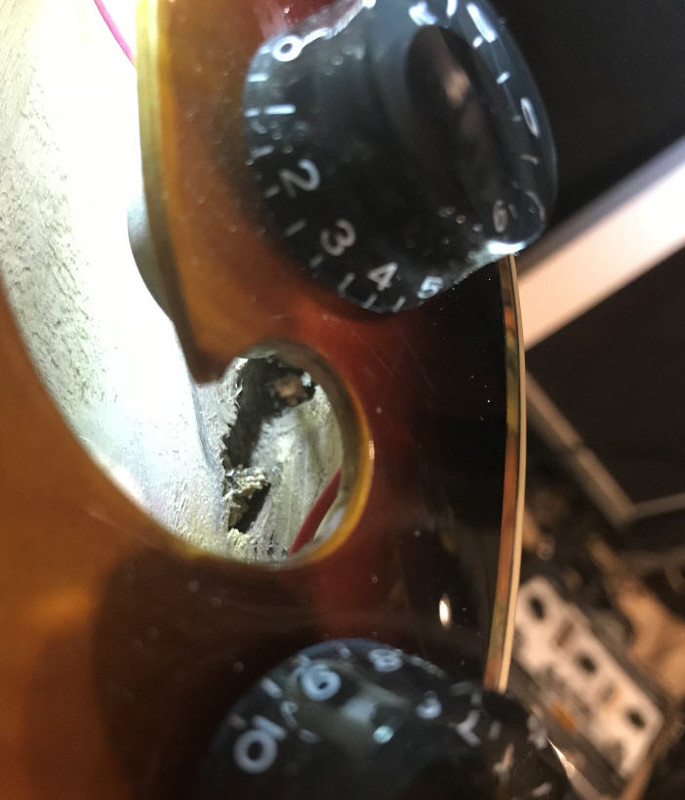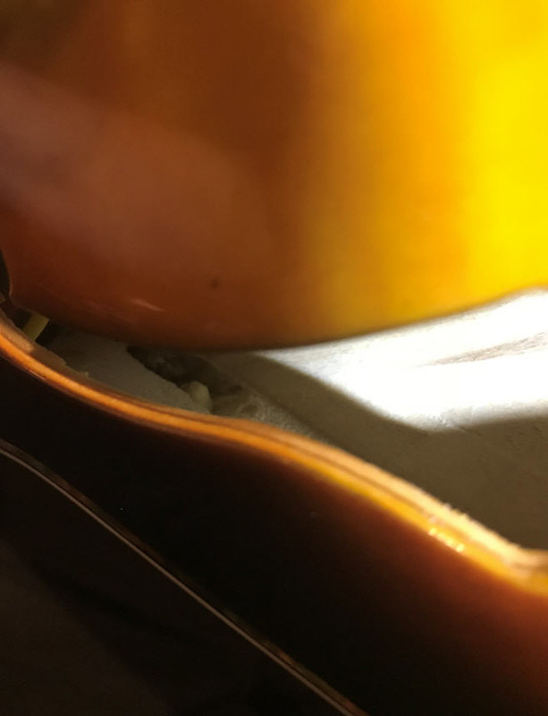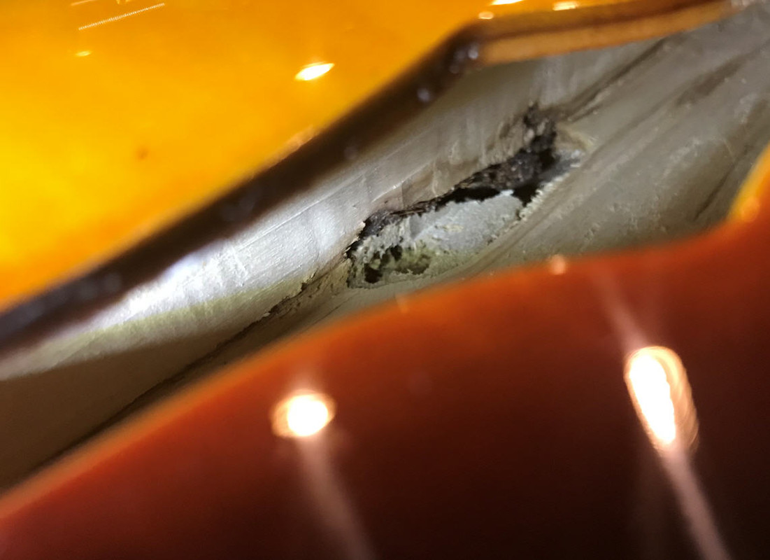 В принципе это решаемо, поменять лады и бридж ( остальное можно пока оставить, главное избавиться от первоначального рвотного чувства). Но...делать этого полагаю ни в коем случае нельзя, пока не пройдёт года 2-3, ну или хотя бы, как минимум год, чтобы посмотреть, что произойдёт с этим экземпляром через год. А произойти может следующее. Естественно, когда мужчина видит дырку, ему интерсно её изучить. А когда дыкри такие большие kak F, сам Б'г велел. И когда я заглянул внутрь, я реально ужаснулся. Никто никогда нам не скажет материал, из которого они изготовлены, но сдаётся мне, судя по мягкости, которую я определил просунув пальчик в дырочку и нажав ноготком, что это что-то типа бальсы. Судя по всему нижняя дека и бока вырезаны из одного куска дерева, причём им там на столько ПОХ!!! что это за дерево!!! В моём экземпляре это проеденная термитами с вырванными сучкАми х...ета. Проедины прослеживаются от средней балки, уходят в заднюю часть корпуса и далее в верхнюю часть обечайки, и то же саме в нижней, причём дыры более чем конкретные. Плюс ко всему, по всей нижней части среднего бруса идёт мягкое волокно, которое теоретически должно треснуть через какое-то время. В общем п..здец редкий. Антонио Тсай, при всей его ладовой криворукости, просто Страдивари. Успел крутануть анкерную гайку. Вроде работает...ВРОДЕ, но утоплена так глубоко и выкрутить её, судя по всему не удастся, т.к. на выходе она уже упирается в дерево ( как её туда вонзили - загадка) с остатками выдавившегося клея. Да даже и хрен бы с ним, всё бы это ничего, все эти лады, железки и прочее, но проеденная, вырванно-сучковатая гниль внутри...priceless!!!
