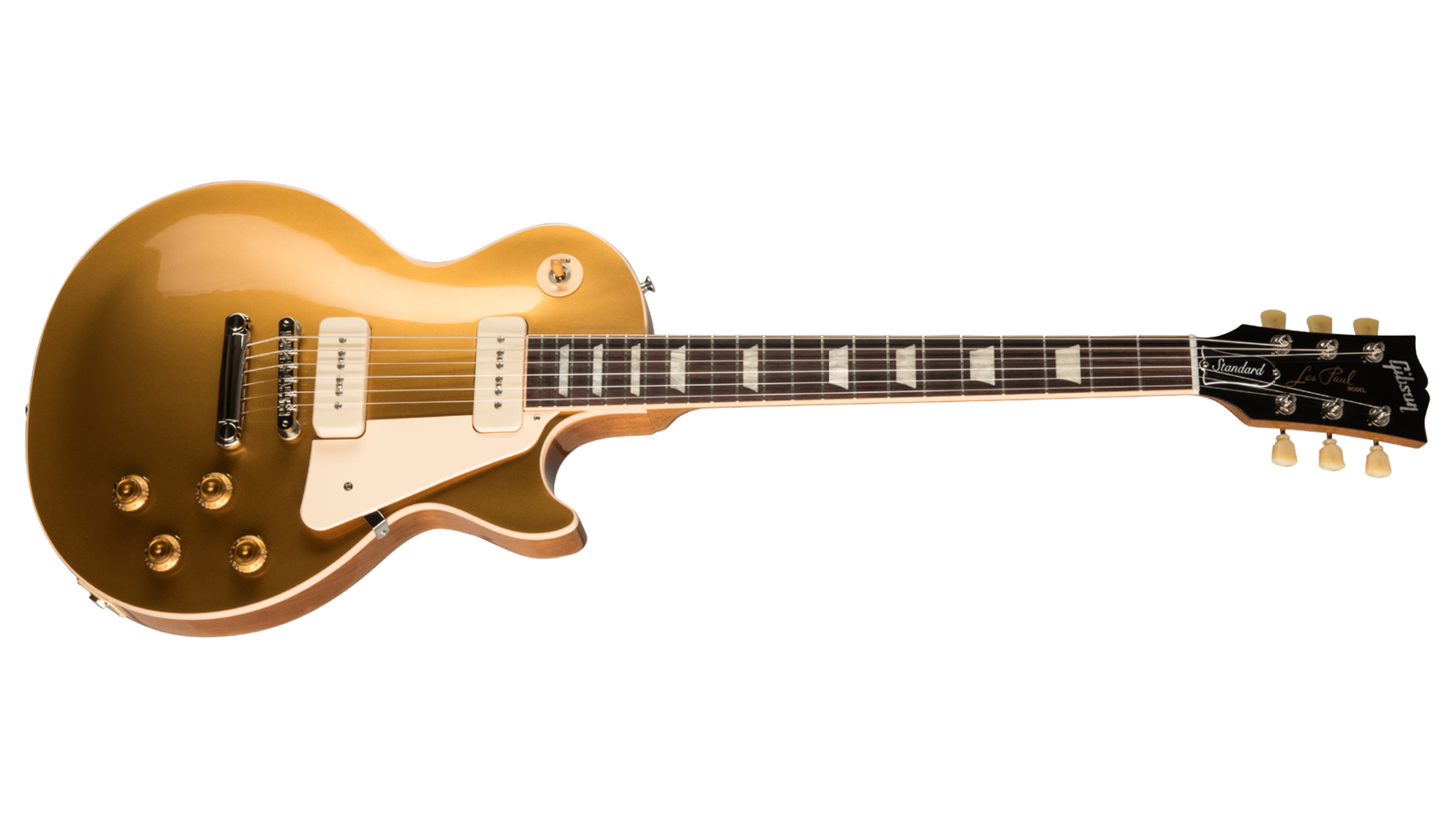 Les Paul Standard '50s P90Based on the iconic 1955–57 Les Paul Goldtop with Tune-o-matic bridge and stopbar tailpiece, the new Les Paul Standard 50's P-90 represents the most sought after features from this era. Like the originals, the body is crafted from a solid mahogany body with a maple top, and the vintage 50's profile neck is crafted from mahogany with a rosewood fingerboard and trapezoid inlays. Period correct hardware include an ABR-1 Tune-O-Matic bridge, aluminum stop bar tailpiece and steel studs. Vintage Deluxe tuners w/ Keystone Buttons, amber Top Hat knobs with pointers and amber switch cap complete the vintage style appoinmets. The classic P-90 pickups (neck and bridge) are loaded with AlNiCo V magnets and the handwired control assembly features Vintage Audio Taper 500k Pots and orange drop capacitors. Just like the originals, available in the Gold Top finish with natural back.