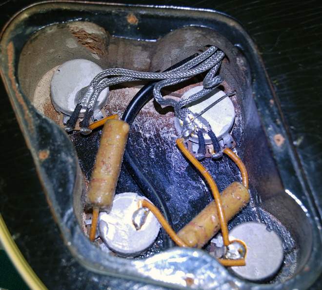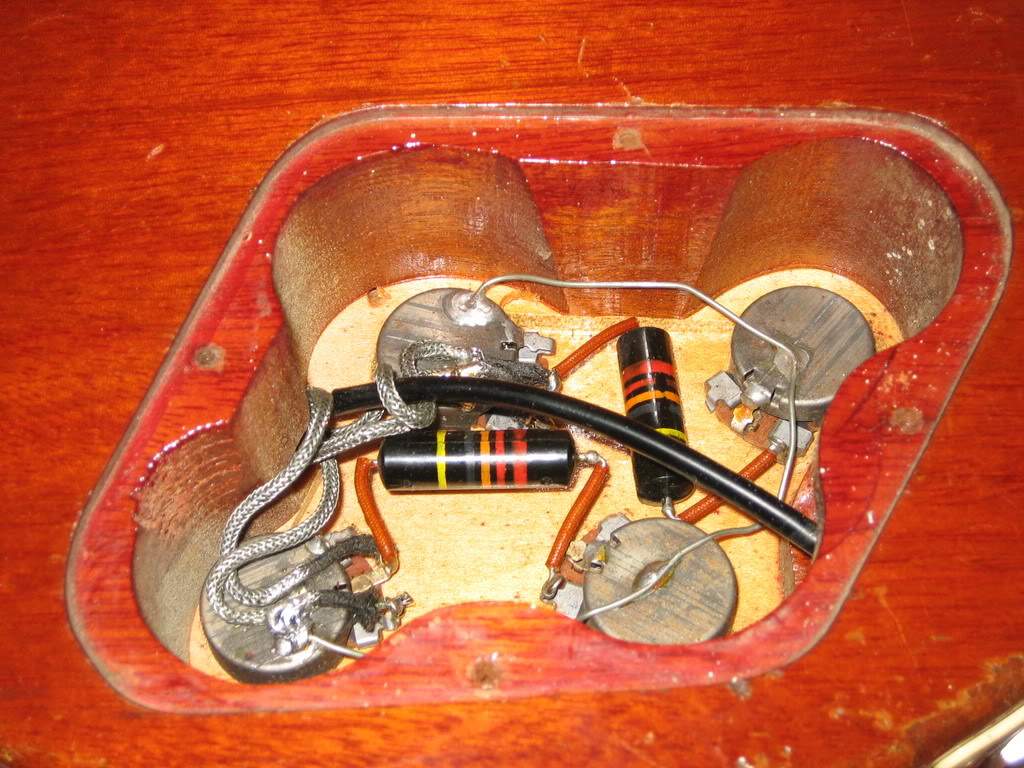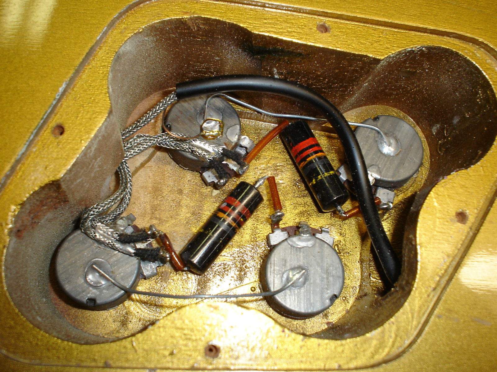я вообще при пайке пот. громкости сразу же загибаю эту ножку потенциометра и припаиваю ее к корпусу, на землю, как это всегда делали на гибсоне, а не как ты - через проволочку..