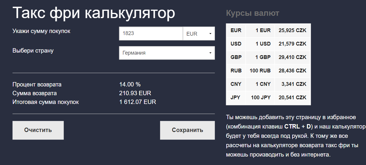 По калькулятору такс фри возвращают германских 14% на границе
