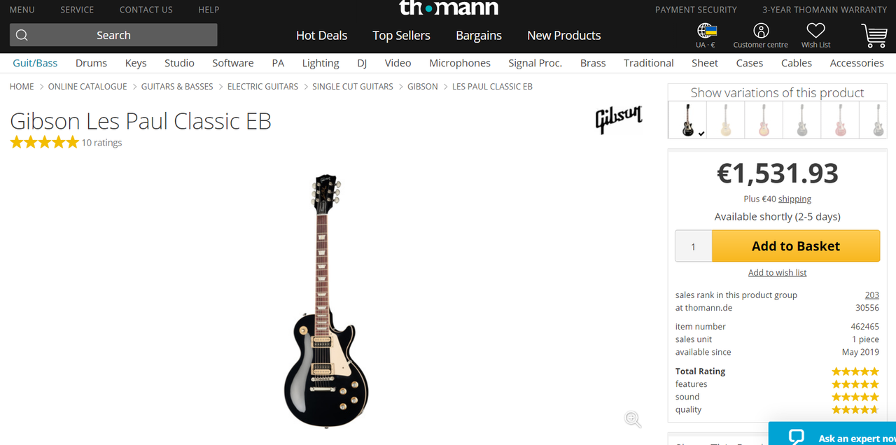 Если мы выберем страну Украина, то получаем цену €1,531.93 Plus €40 shipping