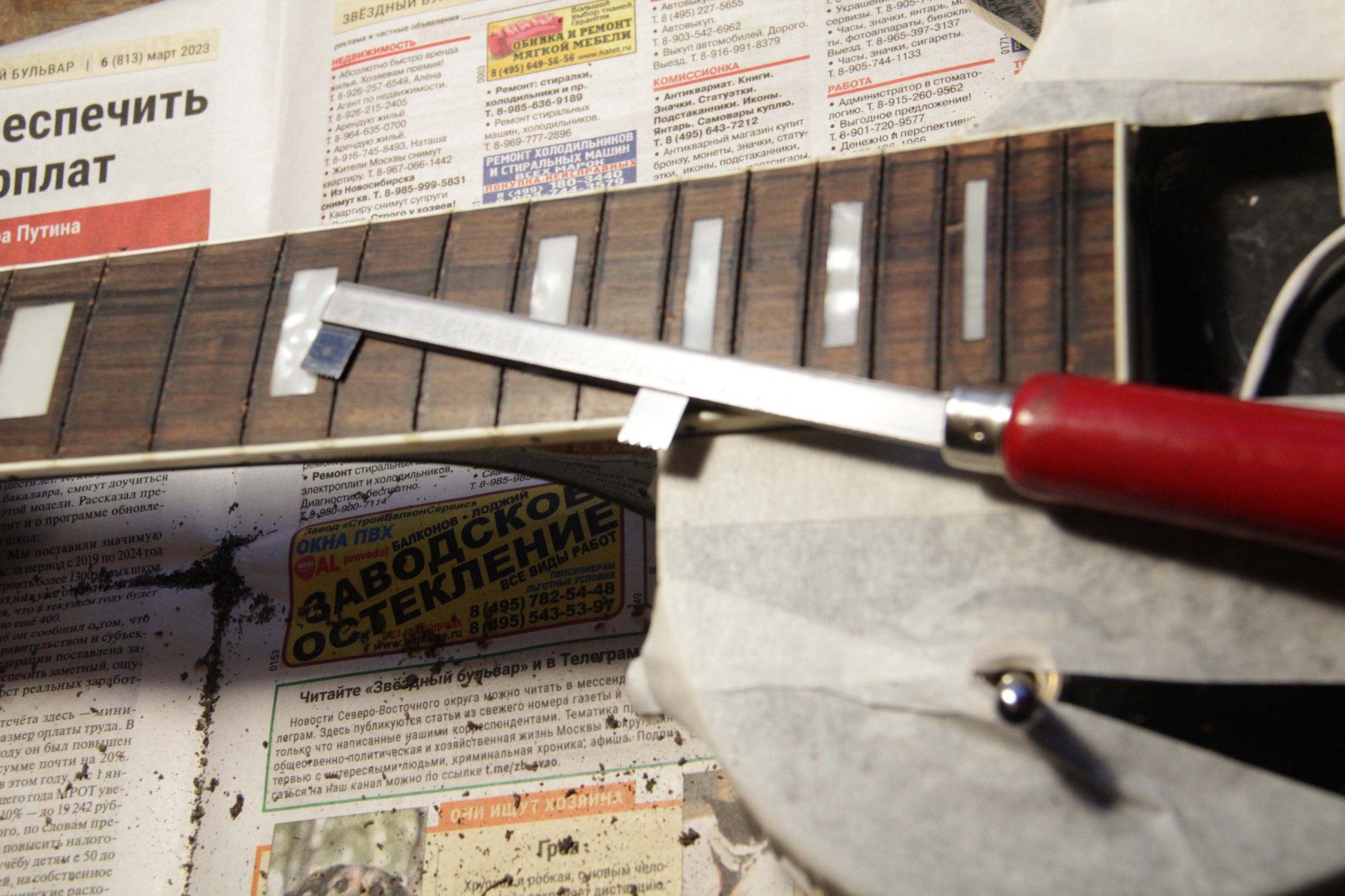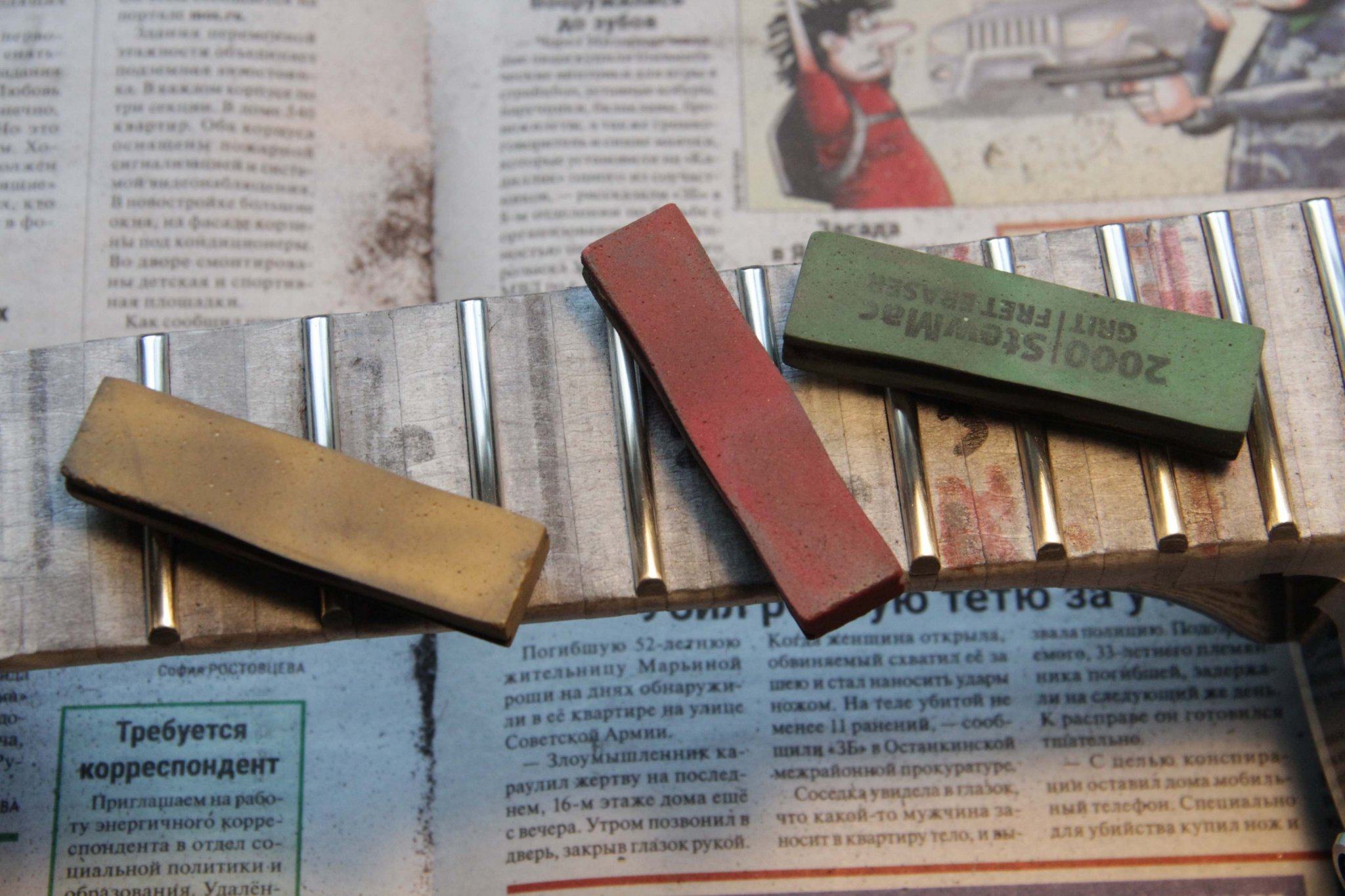Второй этап – надо бы их нарезать соответственно ширине грифа на кусочки.. вот тут и началось.. что стоит нарезать любые другие лады нормального размера?? Чпок-чпок, и в дамках..