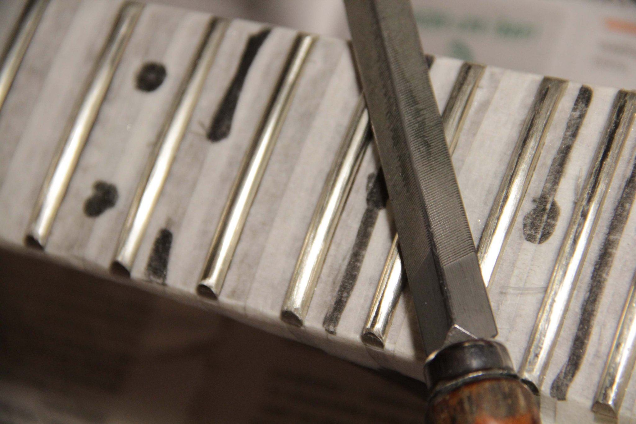 пришлось точить их тупо напильником, дешевым и крупным.. это плохо.. поскольку невозможно их сделать по бокам одинаково.. это упражнение длилось раз в пять больше запланированного на такую операцию времени с любыми обычными ладами.