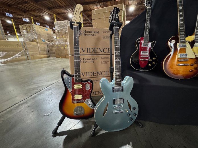 ЧТО: Сотрудники таможенной и пограничной службы США (CBP) совместно с Службой расследований внутренней безопасности США (HSI), Департаментом шерифа округа Лос-Анджелес (LASD) и Gibson объявляют о крупнейшем изъятии электрогитар Gibson за всю историю. В результате многоагентской операции было перехвачено более 3000 поддельных электрогитар Gibson на сумму более 18 миллионов долларов, если бы они были подлинными.