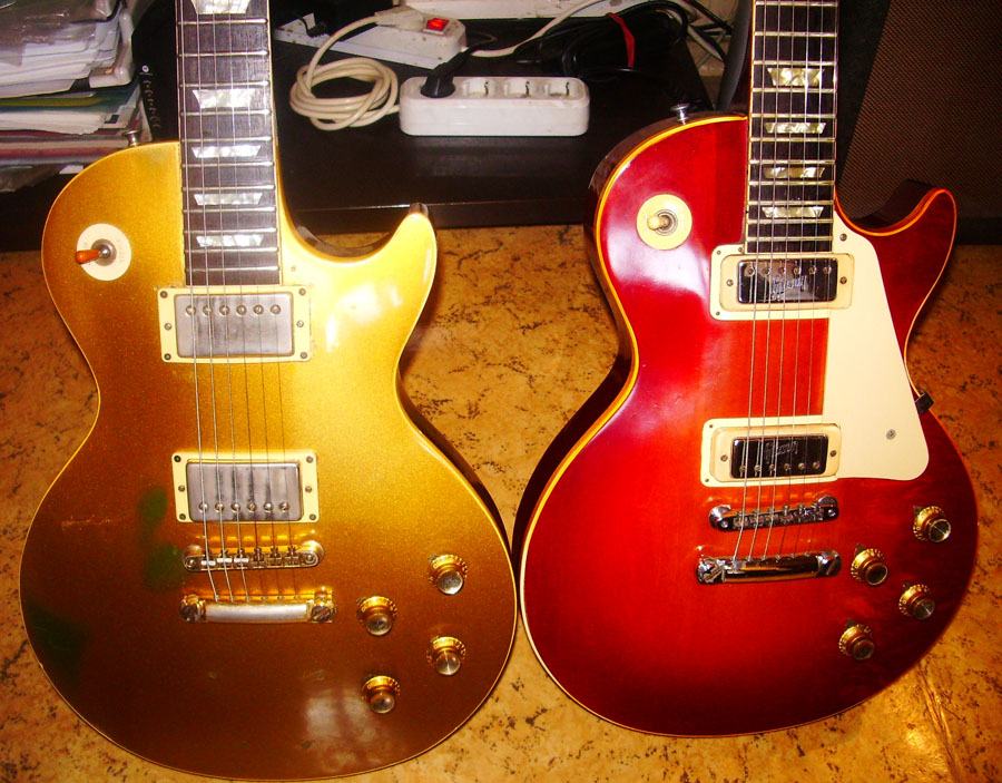 справа - Deluxe 1972 года, очень редкий цвет, какой-то морковный санберст, без желтого в середине, всего 1500 инструментов в таком цвете.. убойная гитара была, несмотря на минихамбакеры, удивительно удобный среднего размера округлый гриф, не тяжелый, охренительно звучал..