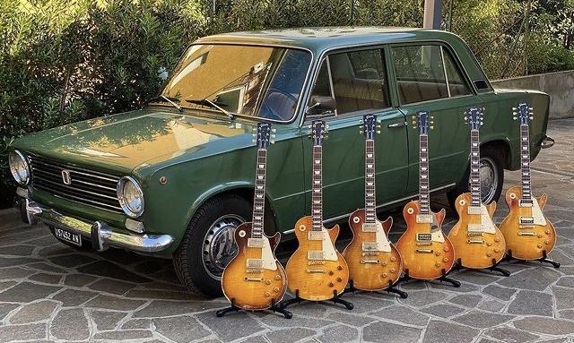 Рядом с автомобилем расположены шесть электрогитар, внешне похожих на модель Gibson Les Paul.