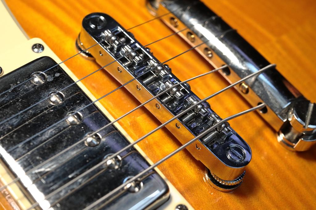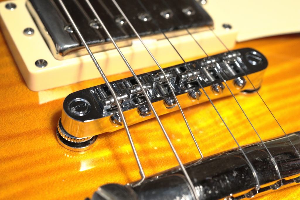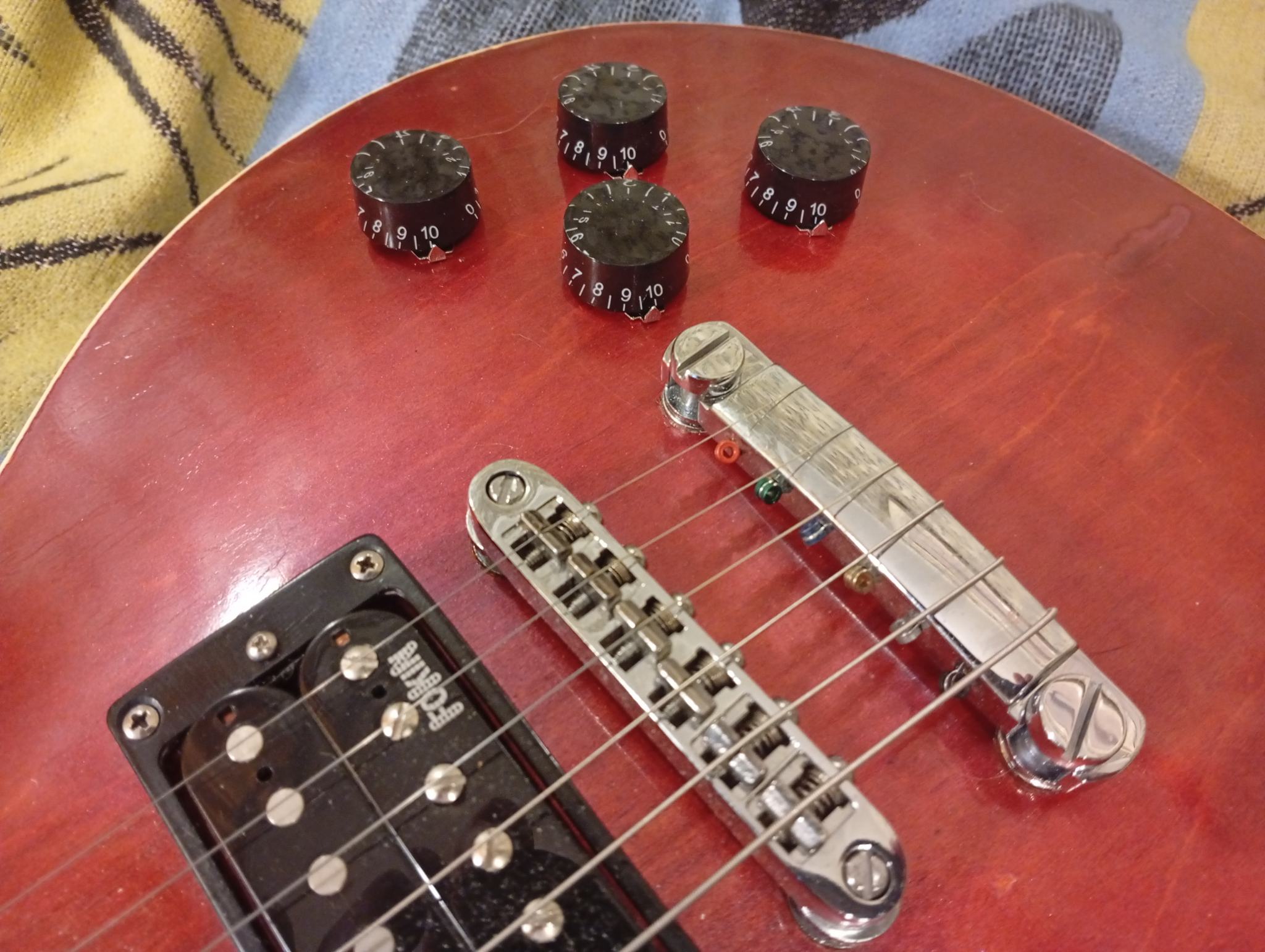 Сегодня, наконец, перестал мучаться, и переставил струны меньшего калибра. Были 10-ки, с которыми я пытался смириться полгода, но так и не смог. У меня от природы тонкие пальцы с маленькими "подушками" (не знаю, правильно я это называю). Думал, на короткой мензуре (а-ля Gibson) будет легче, но увы, после пары часов игры было очень некомфотрно. В итоге поставил 9-ку и какое-же удовольствие было снова взяться за инструмент. Но, внезапно, при настройке вскрылся один неприятный момент - хода седла на третьей струне не хватало, чтобы добиться унисона на открытой и зажатой на 12-ом ладу струне. Пришлось развернуть сёдла на нижних трёх струнах (заодно научился разбирать Tune-O-Matic, там была хитрая скобочка, которая мешала снять болтик с седлом). Теперь прям хорошо