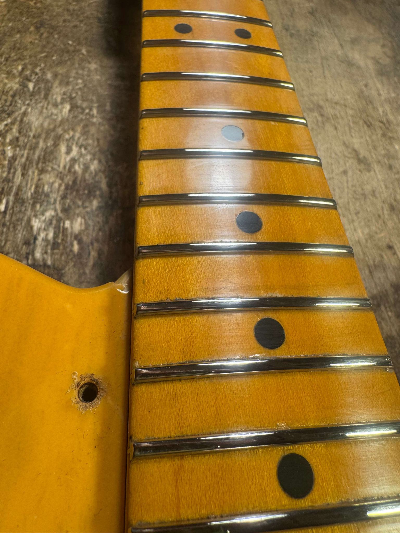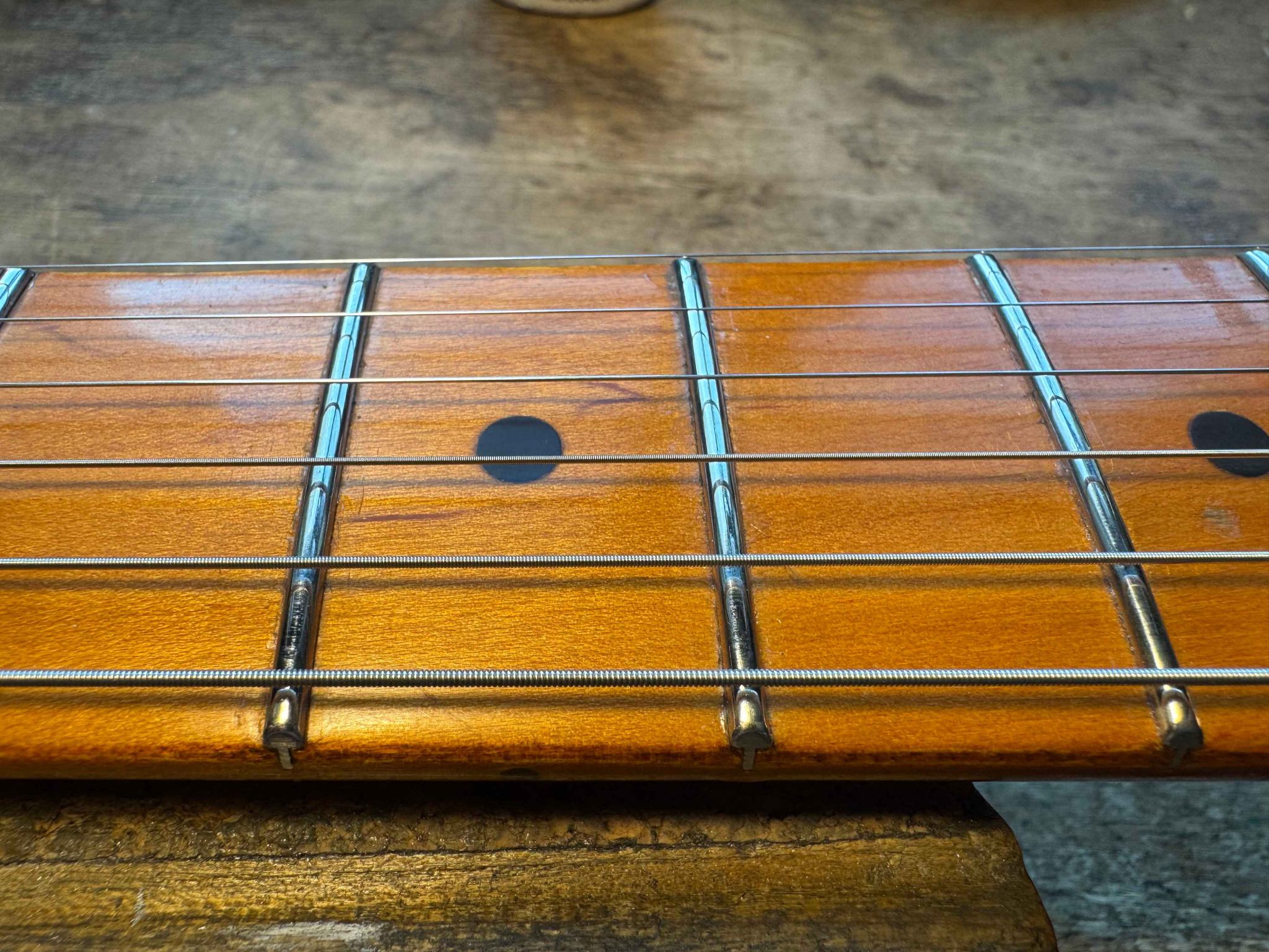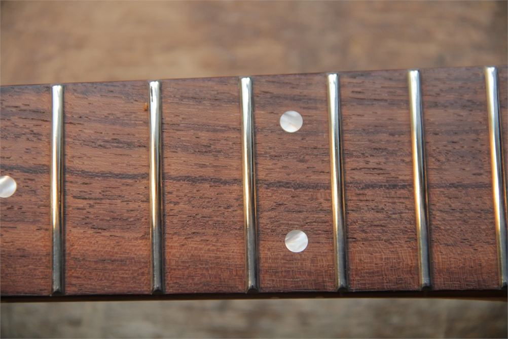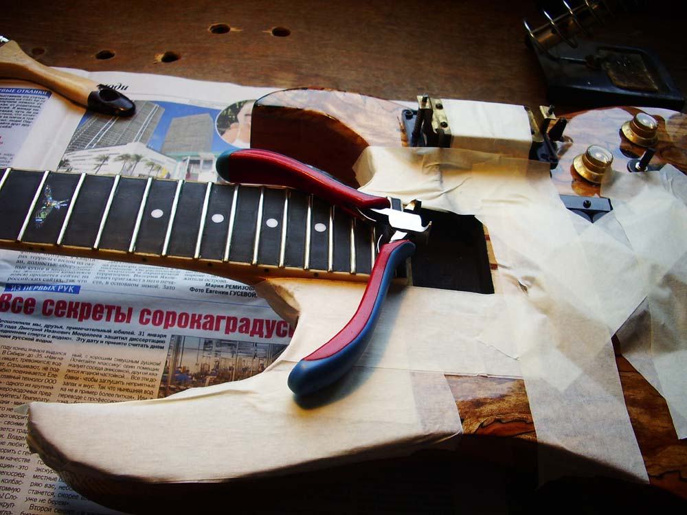 розовая полировочная паста, вбитая в ступеньку между кантом и деревом это прям заглавная тема этой гитары..