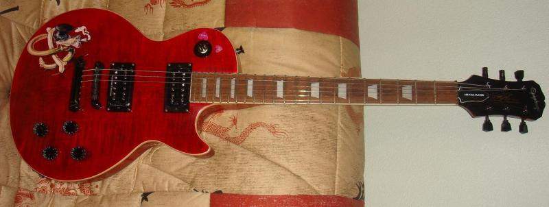 - Надпись Gibson на пере какая-то "не перламутровая", то-есть похожа на обычный белый пластик. И сверху него хозяин, по его собственным словам, покрыл перламутровым лаком, который сейчас облез. Причем очевидно, что надпись именно инкрустирована.