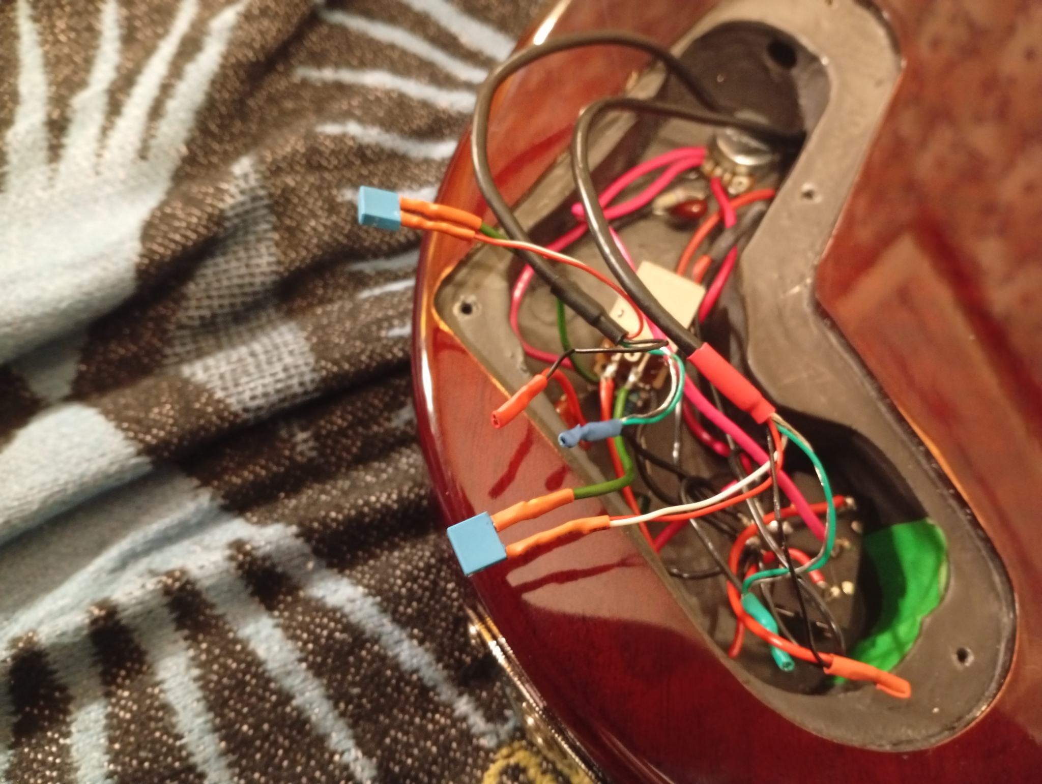 По результатам проделал такую же процедуру на другой гитаре, где было переключение катушек хамбакеров последовательно-параллельно. Но там номиналы конденсаторов увеличил до 22н, с 10н уж слишком много низа пролезало. И звук с отсечкой и без слишком близкий получился, и по тембру и по громкости. На гитаре с верхастыми датчиками на А2 10н еще нормально вписались, и то я думаю тоже поменять на 15 или возможно на те же 22н. Чтоб еще более синглово получалось.