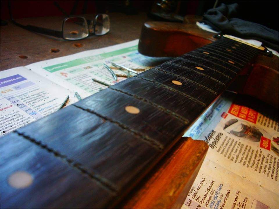 Я примерно пол года привыкал к его круглому грифу, у меня не было таких грифов, он был непривычным для меня, зато теперь он просто как родной.. все, что я на нем сделал – это поменял лады и костяной порог.. лады за это время шлифовал два или три раза, уже ооочень давно хотел поменять, но не было времени.. помогла пандемия..