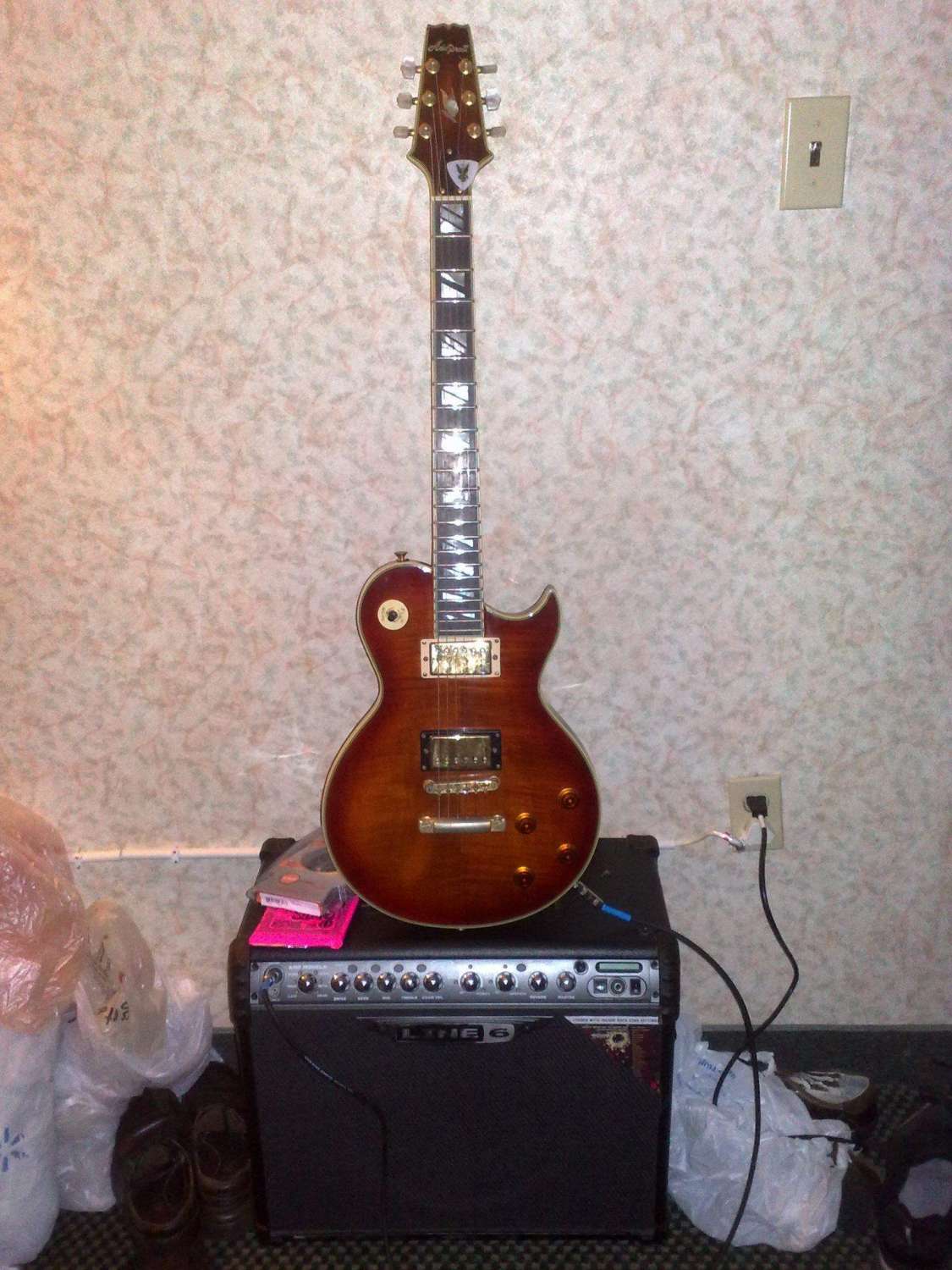 Купил в штатах, когда ездил по Work and Travel. Хотел сначала взять Фендер или Гибсон, а в итоге остановился на ней. С родными звучками среди всех б\у гитар до 600$ в наличии из "GuitarCenter" она рвала всех. Ну я и взял. И комбик Line 6 Spider 100 или 120 взял за сотню баксов, но его не стал даже пробовать везти в НЙ- а зря, до сих пор жалею. Крутой был, эх. Ну, собственно, по гитаре: