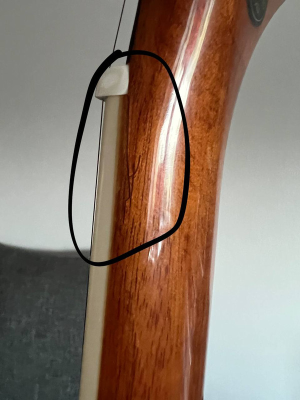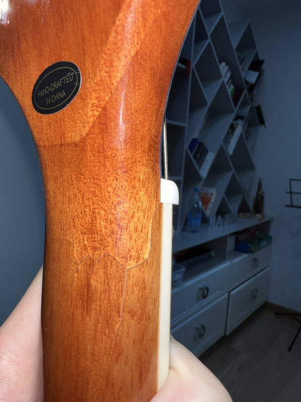 Что примечательно, трещины идут от порожка. У меня на Эпи ЛП Кастом 2022 из темы ниже тоже небольшие трещины по лаку с завода, примерно в 5мм длиной и тоже от угла порожка с обеих сторон. Я так понимаю лак торчит, а они на него сажают порожек и придавливают. И скорее всего также гнется гриф, как и у меня, поэтому трещины пошли дальше. Это исключительно мое субъективное мнение и мои домыслы.