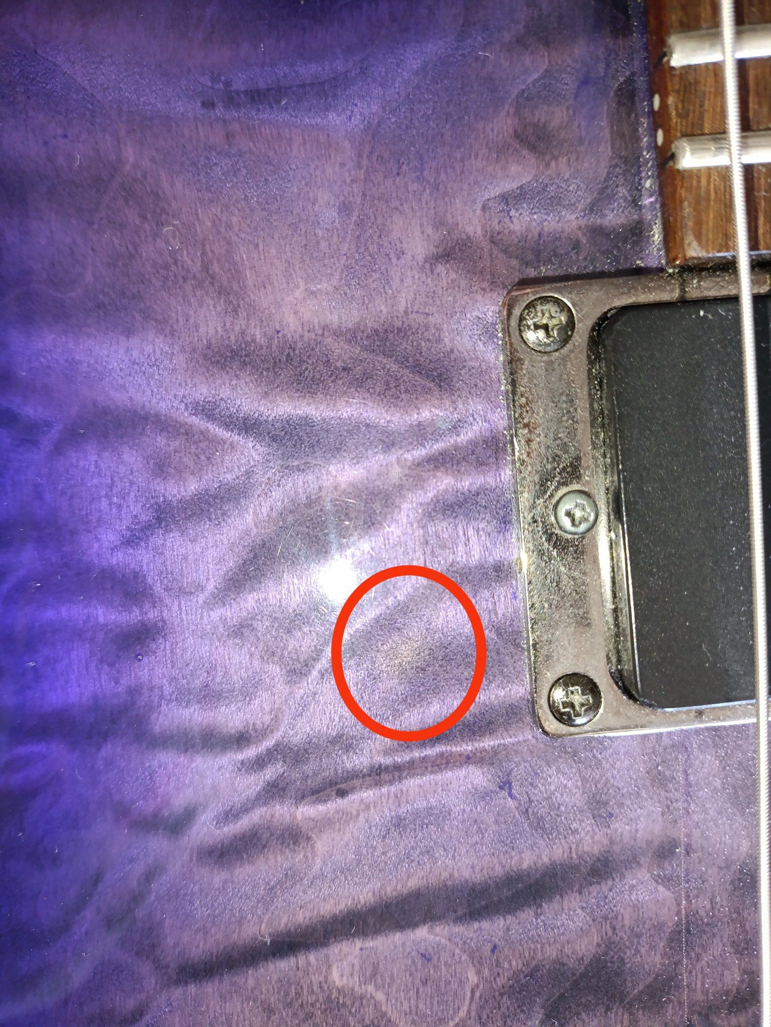 На фото видно желтор-оранжевое пятно на фоне фиолетовой краски, причём на нем также видна текстура дерева, так что моё предположение, что конкретно оно не прокрасилось на заводе, но как такое могла быть, если они красятся из распылитилей под давлением?