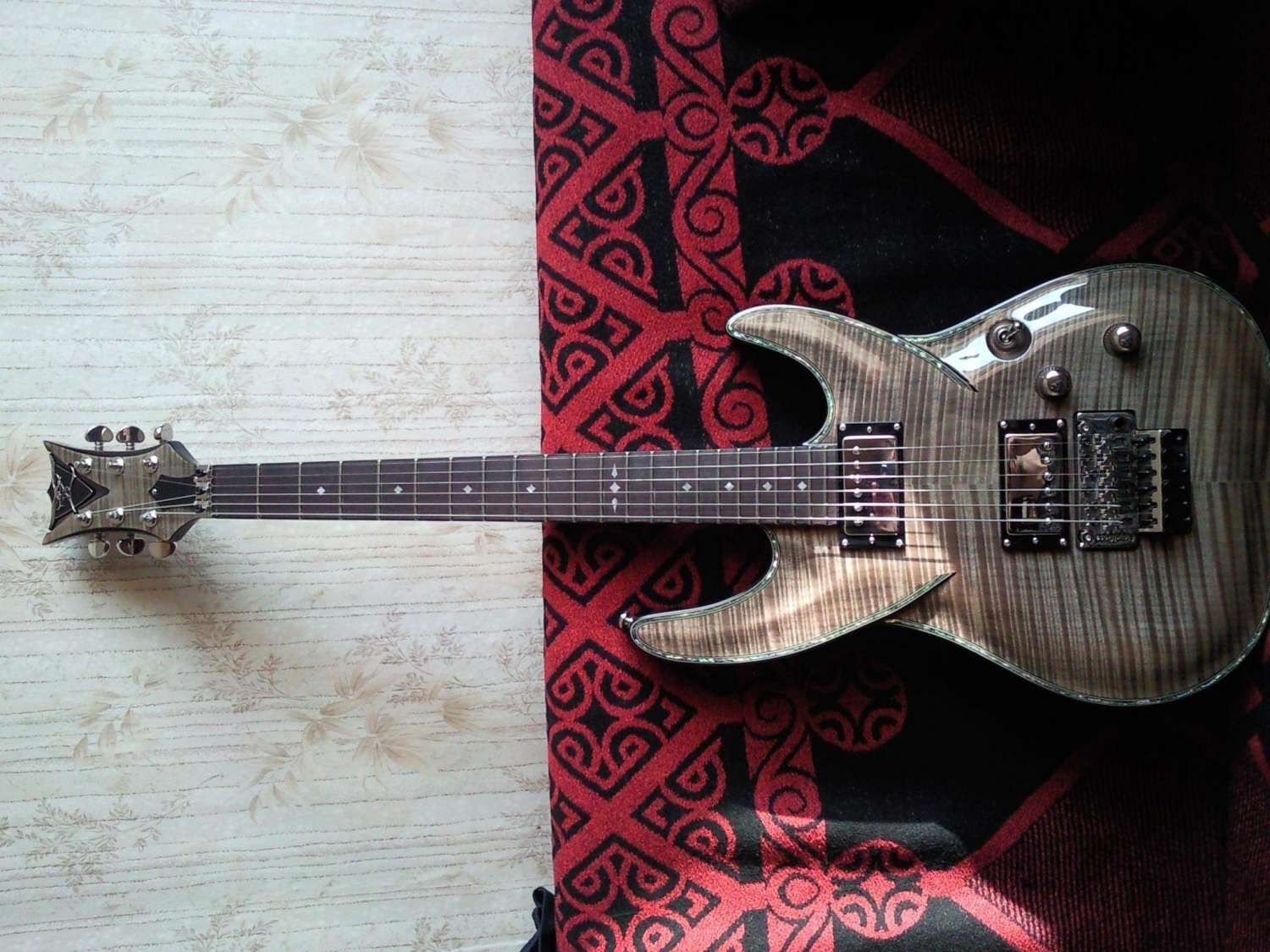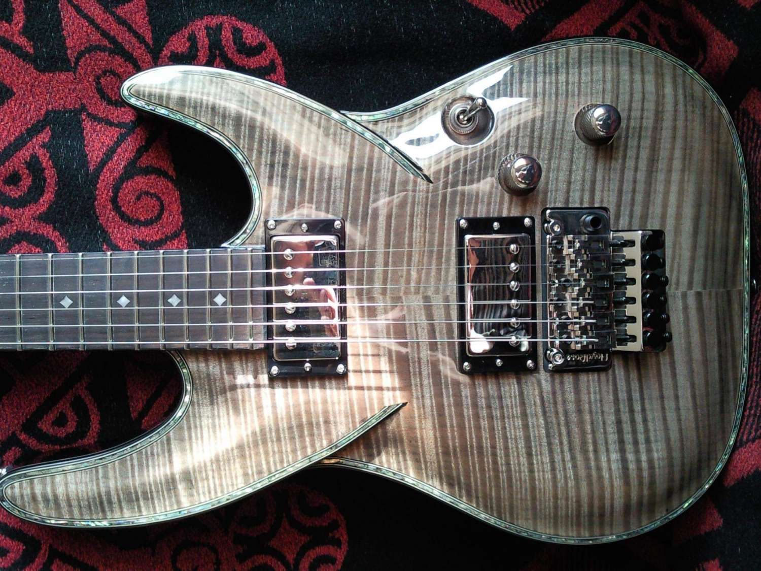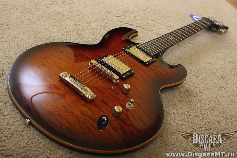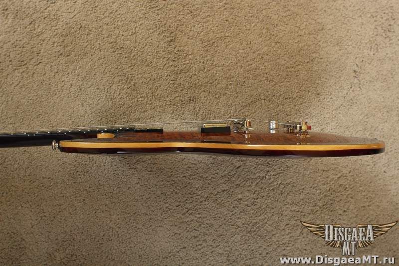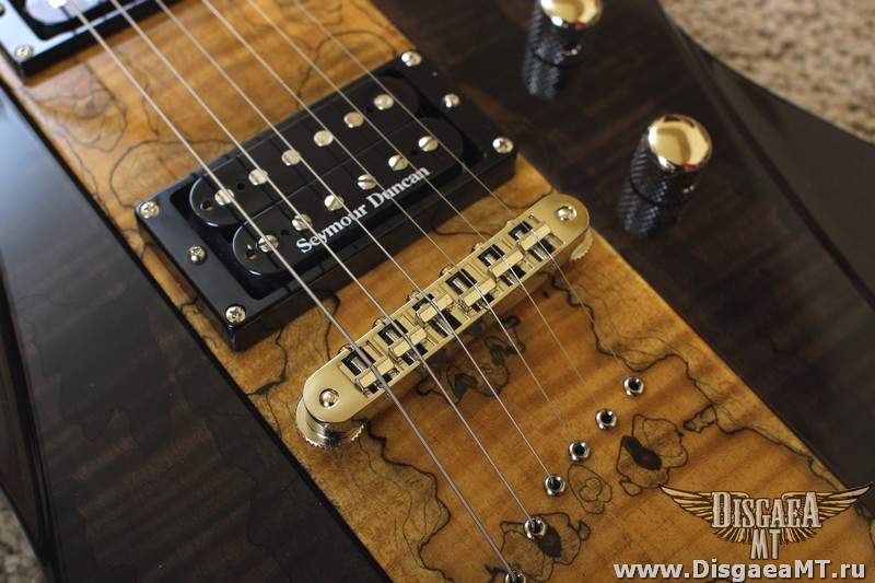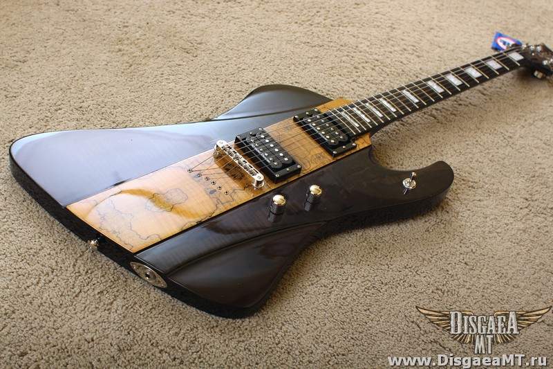 Ещё весьма заставил себя зауважать Hailfire. По дизайну - эдакий Файербёрд с псевдо-сквозным грифом. Гриф то на самом деле обычный, вклеенный (производитель говорит о дескать очень глубокой вклейке - не знаю, не проверял), но что сразу радует и вызывает уважение при первом осмотре, ещё до того, как воткнул её в усилок - видно, что DBZ не экономят на качестве фурнитуры. Стоят честные Seymour Duncan (без всяких там "Дизайнед") SH-4 Jeff Beck в бридже и SH-1 в нэке - всё по классике. Бридж - не знаю, чьего производства, но внешне похож на Gotoh. Тюн-О-Матик нэшвиловского типа без прорезей под отвёртку, выглядит надёжно и убедительно. На днях струны менять буду - погляжу, что там за лого на обороте. Струны с завода тоже кстати, не самые плохие - обычные Д'Аддарио. Даже не ржавые и вполне себе новые и звонкие по звуку.
