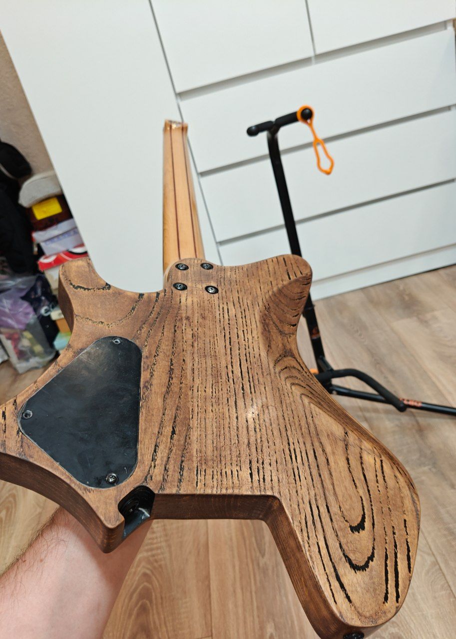 Если у вас корпус из ясеня, без топа, то вышлифовывать его достаточно легко реноватором. У меня недорогой реноватор, купил треугольные наждачки на липучках. Не помню, кажется чистота 600.
