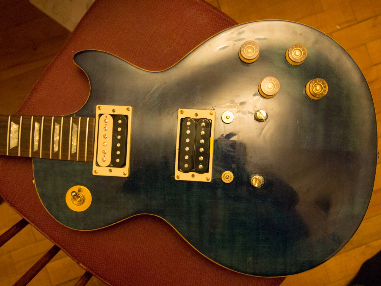 На глаз дека толще чем у студио, очень похоже на полновесный леспол. Окантовка тоже нам намекает на то, что гитара не студио. Кто -то говорит, что это сняли краску. Я не понимаю о чем речь, там видно дерево, что снимать? Щупая китайские эпифоны я видел, что окантовка у них под лаком, а в штатах, на фабрике гибсон, рабочие ножом обрабатывают пластмассовую окантовку. У эпифона наощупь не пластмасса. Переключатель на фото плохо видно, мб он и похож на родной, но я не уверен. Все намекает на производство копии в Китае.