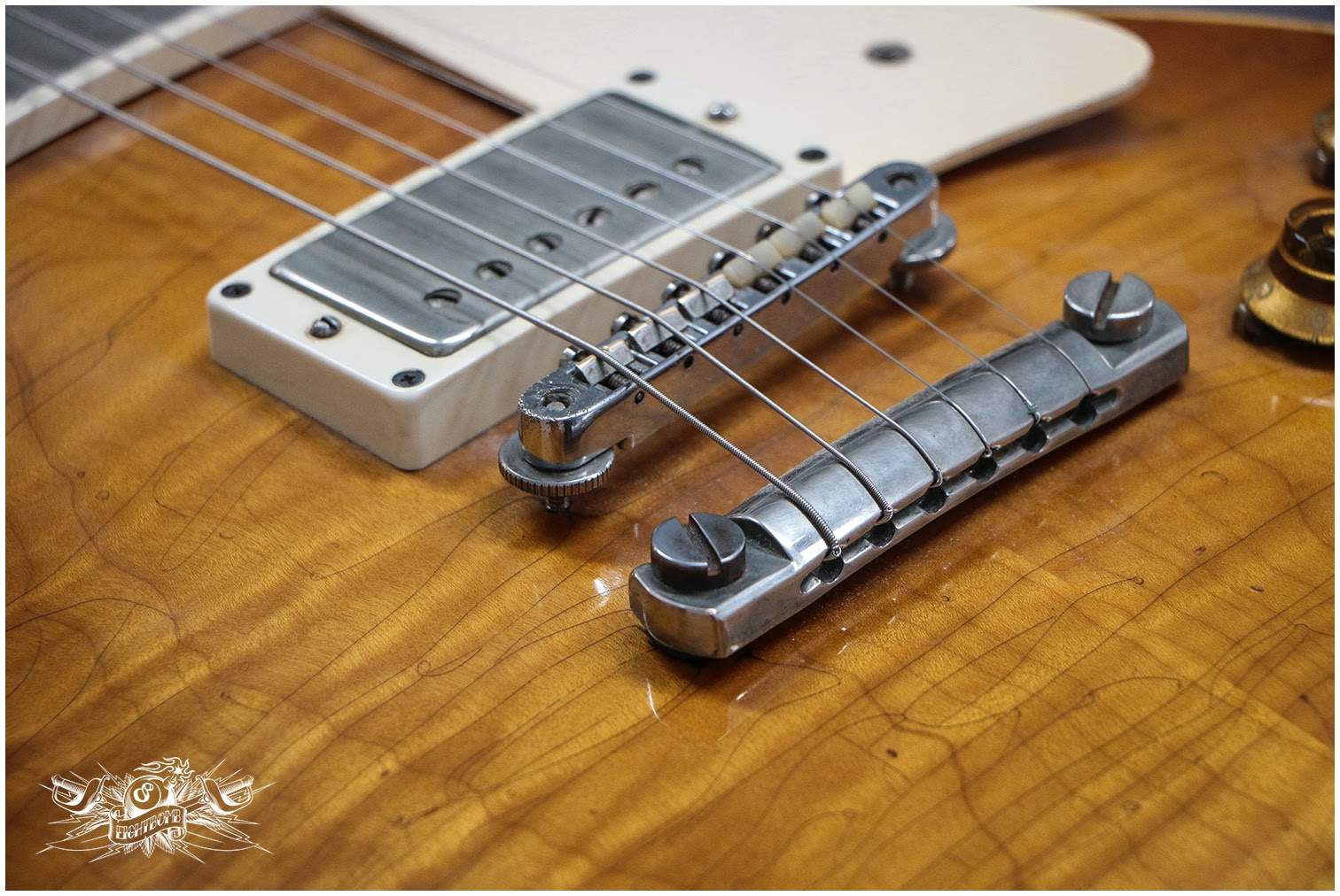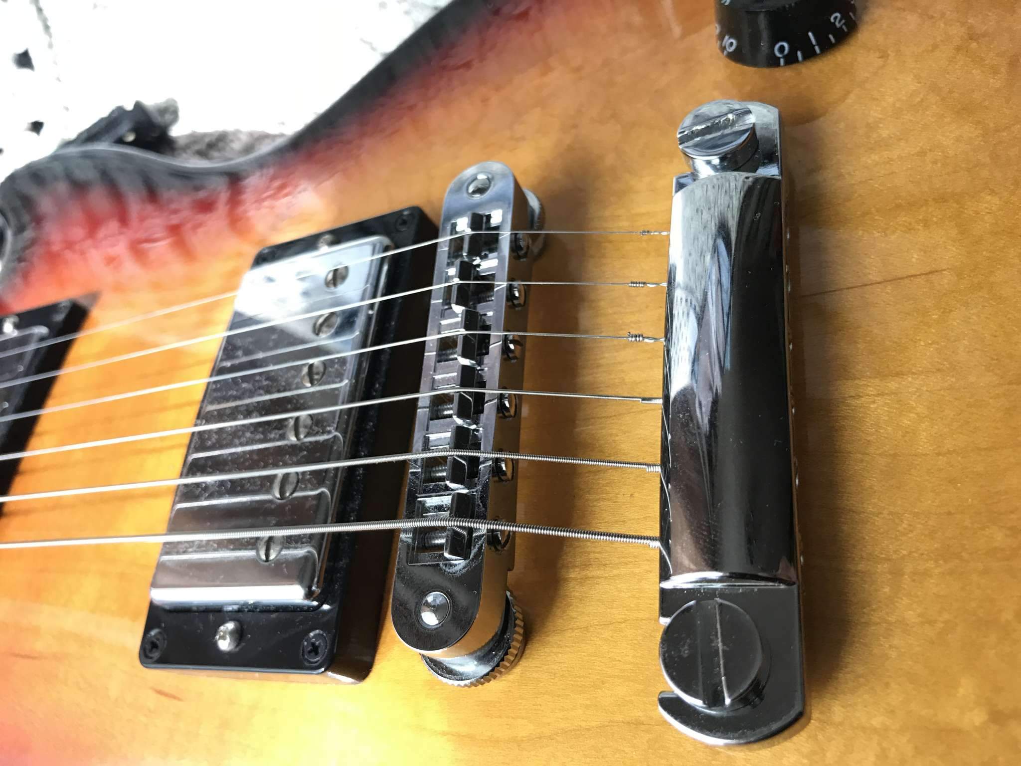 У меня раньше был студио. На первой немного пропилил край бриджа круглым надфилем. Но даже если касается то на слух не заметит никто. Просто в теории -не должно касаться.А теория и практика вещи разные. А разницу в звуке чувствуете? Еще от регулировки мензуры зависит. При тонких 1 струне подставка под струной стремится к переднему краю. А при толстых 1 струне она уходит назад. От этого и меняется угол. Ток что сначала мензура идеально.
