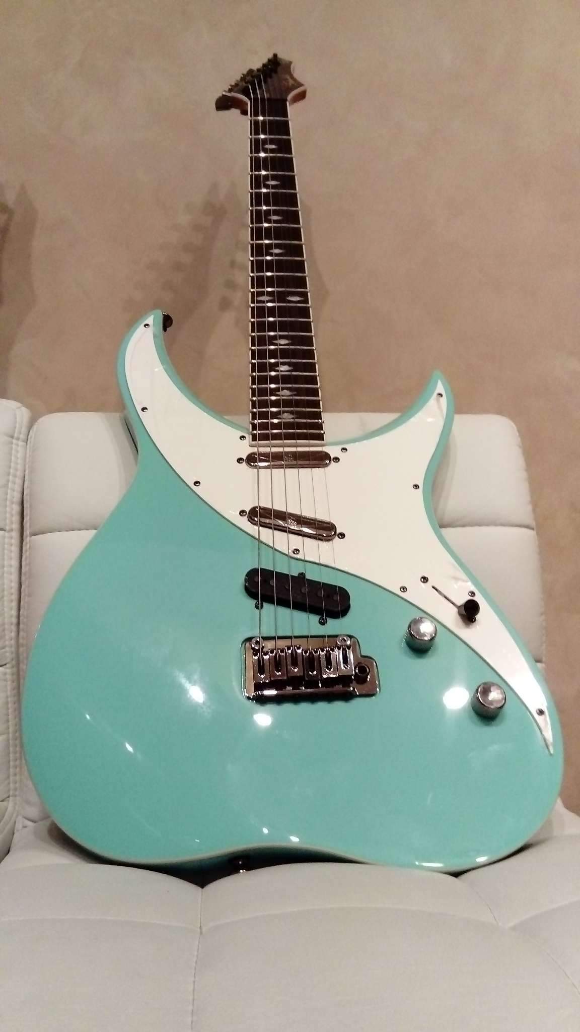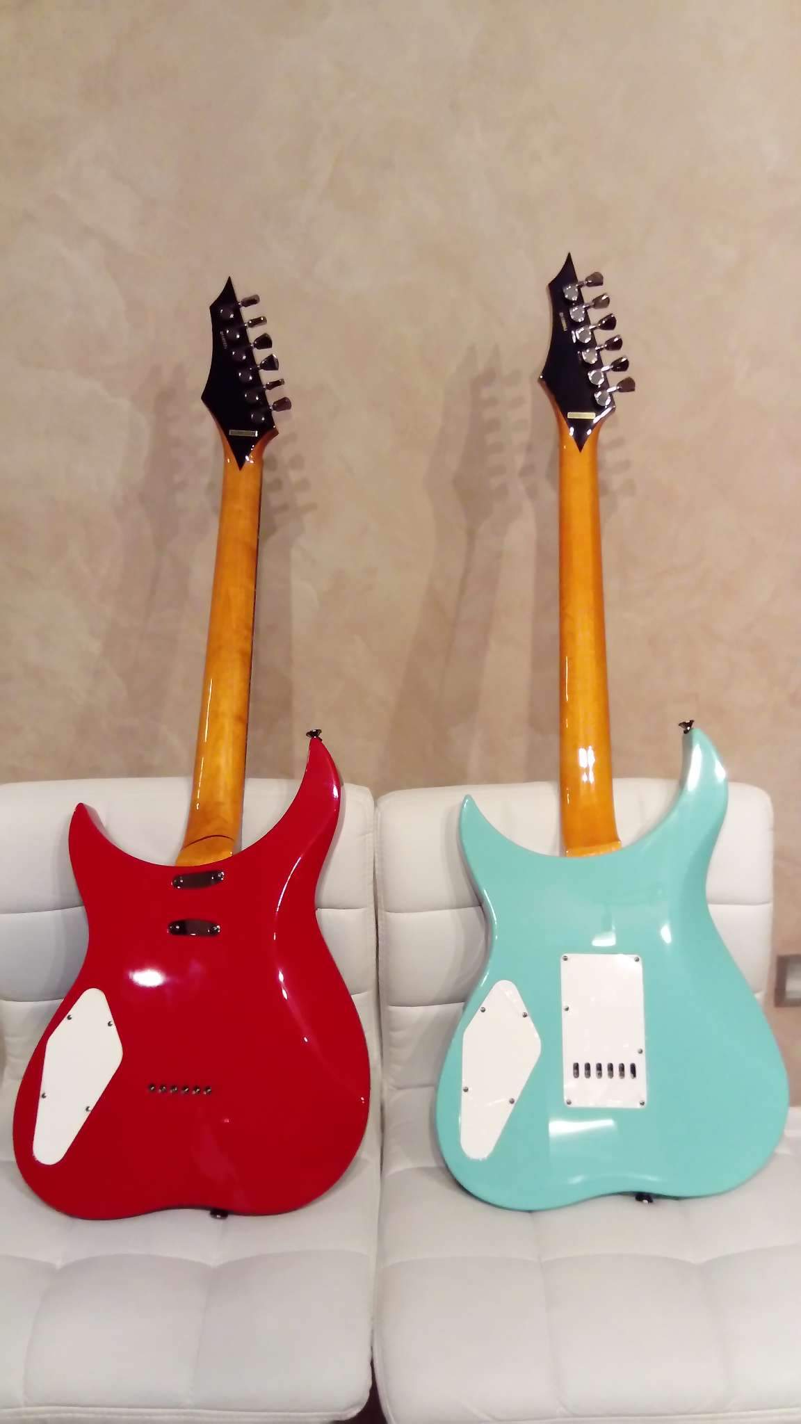 На фото меня привлек лакированный гриф (нравится когда именно так покрыт, полушершавые где только легкая пропитка почему то категорически не люблю), наличие определенных цветов, интересный метод крепления грифа, на RS20 вклейка но они умудрились совместить прозрачный лак грифа и краску дэки на стыке - первый раз такое увидел. Ну и то что они сами звукосниматели мотали, любопытство вещь сильная, да и комбинация звучков как у телека и микс со стратом - в общем сплошное любопытство.