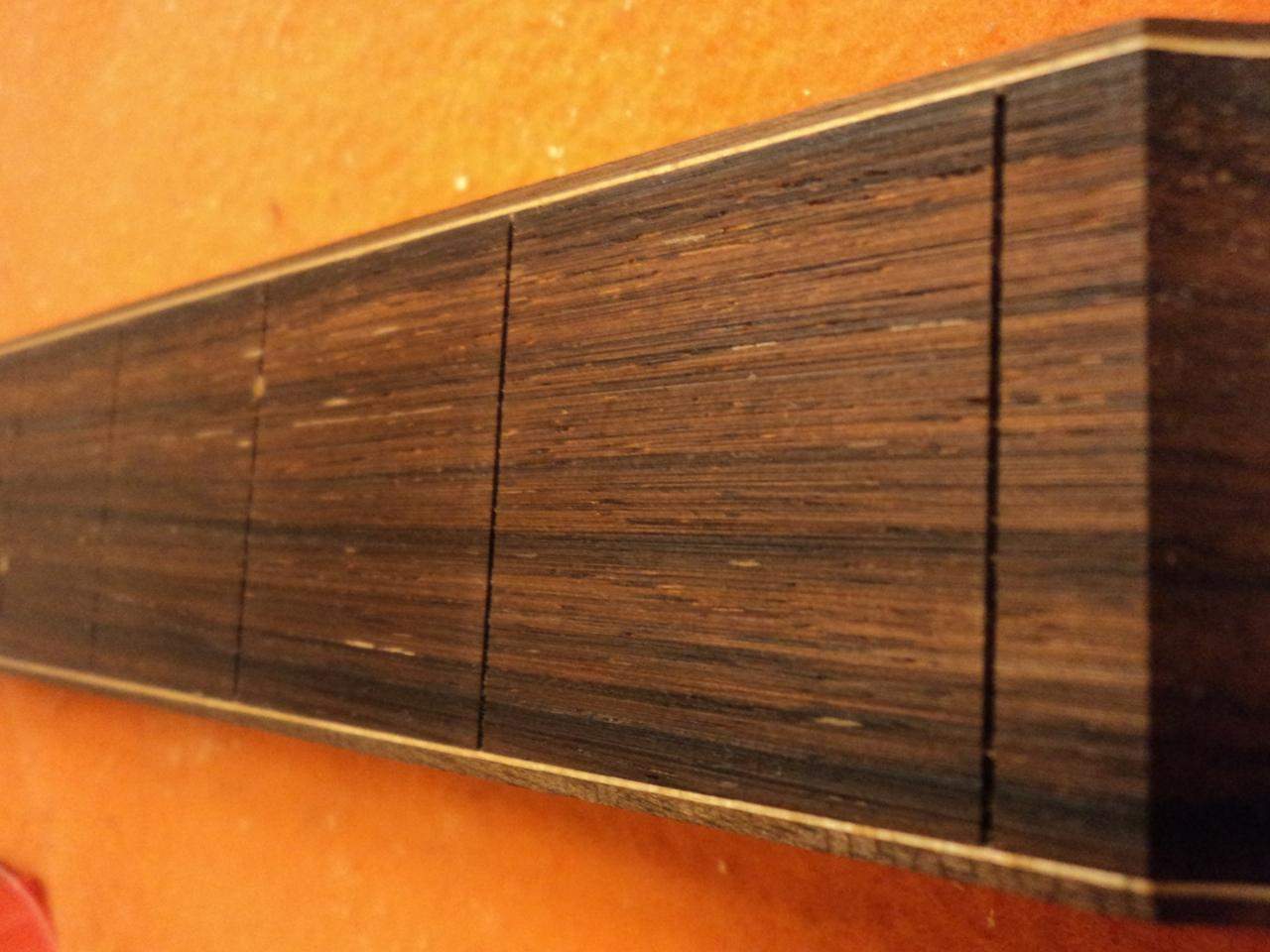1. Видимая для глаза (кленовая) часть вашей окантовки слишком тоненькая и плохо видна. Поэтому свою главную функцию - явно подчёркивать форму грифа, выполняет так себе.