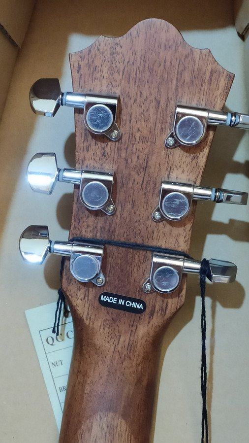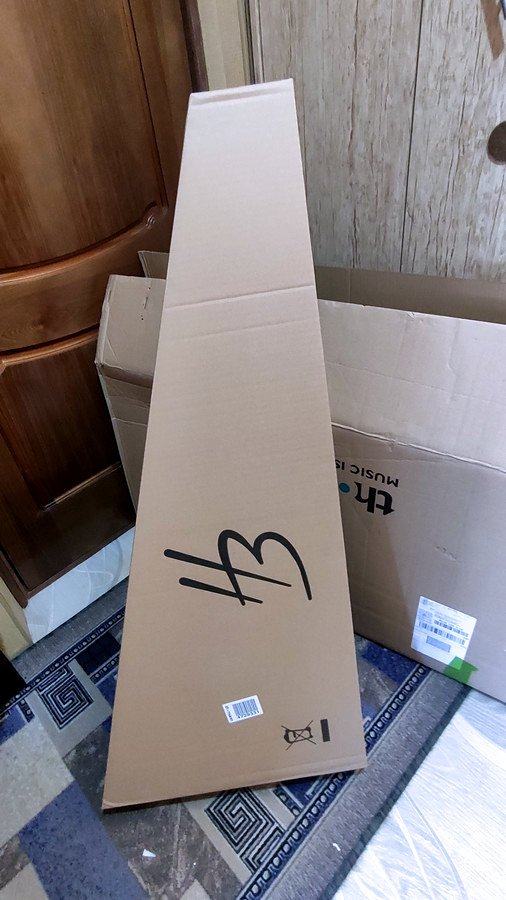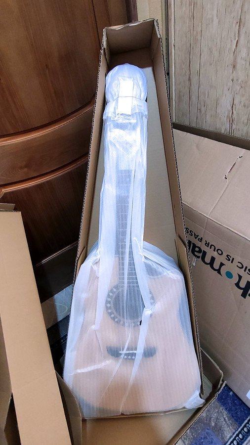 Посылка упакована так себе - картонка в полиэтилене, внутри бумажный наполнитель, там ещё картонная коробка, непосредственно с гитарой. Но, видимо, сумма страховки такова, что перевозчик аккуратен. Да и хитросмятая бумага между внешней и внутренней коробками, как-то защищает, всё целое. Коротко гитаре: дредноут )). Строит, лады не торчат, всё аккуратно, ПОКА не требуется никаких улучшений, разве что струны поменять (на моё ухо - басы глуховаты). Поскольку гриф сделан их бука, который немцы называют Pau Ferro (железное дерево), думаю, лады так и не вылезут, знаком я с этим деревом, действительно - железное: дружба-2 тупилась и ломалась, когда капониры в ГСВГ строили