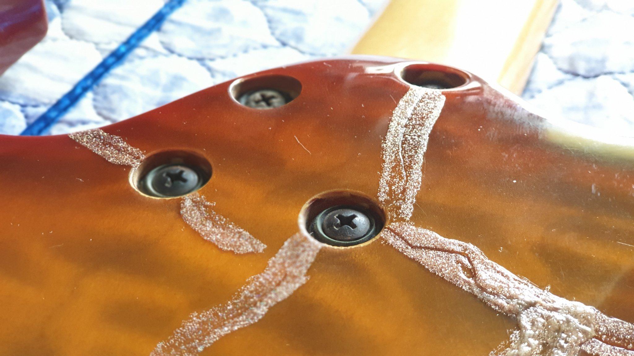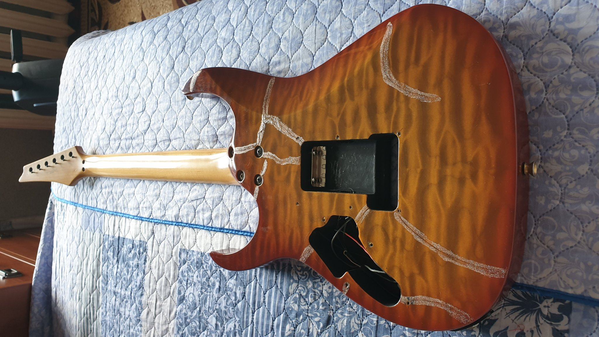 Осталось: гриф 1шт., корпус 1шт (и то я его стамеской под хамб и под некоторый ход тремоло расковырял), колки 1 комплект.