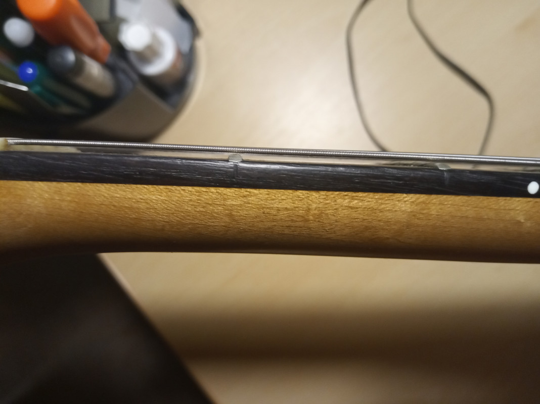 Струны в одной плоскости выставлены, уже плохо - у накладки радиус, поэтому крайние струны ниже должны быть центральных. Высота струн (как минимум басовых) большая.