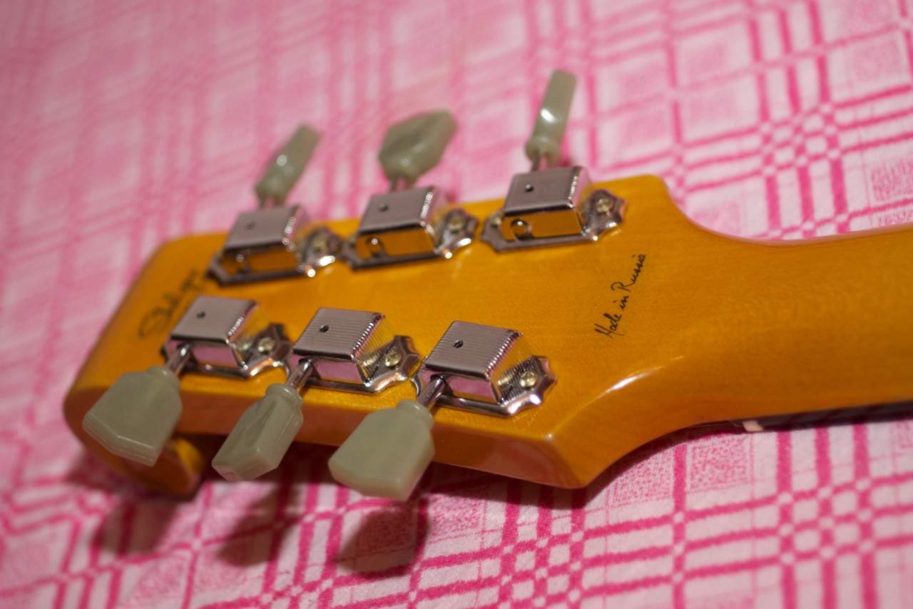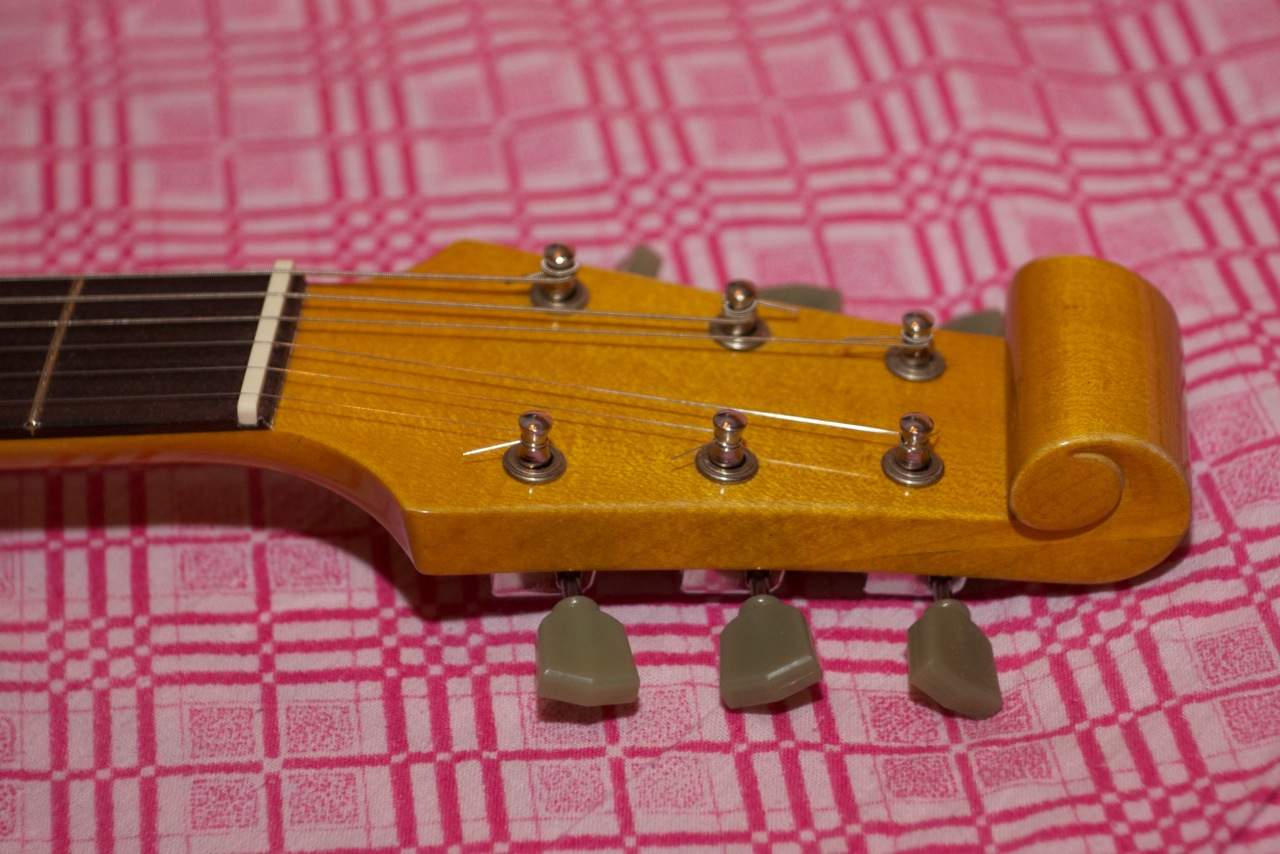 Гриф - отдельная тема. Первый прототип телекастера имел короткую голову с колками 3+3, называют эти гитары Snake Head. Изначально хотел найти такой гриф на ибее, но никто не далает их на продажу, а копии Snake head - это либо Fender Custom shop за 10 килобаксов, либо китай/корея смешные. Потом, в процессе, вспомнил про гитары Burns Marquee - их нестандартные головы всегда напоминали скрипичные. А почему бы и нет? Вот так и получилось.