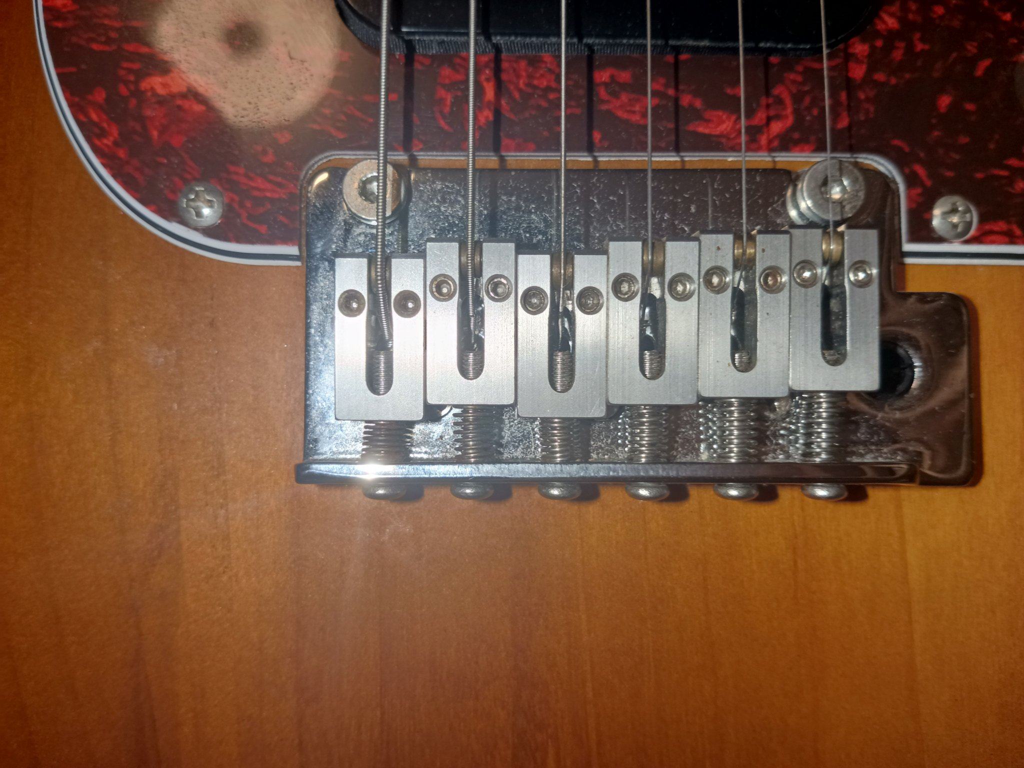 Во-первых это красиво. У нас неплохой блок стоит, тяжеленький, но латунь потверже будет. Плюс седла винтажные мне не зашли. Разблокировал сустейн, вроде даже не плывет строй в сочетании с локовыми колками. Поставил струны чуть потолще, вообще хорошо стало.