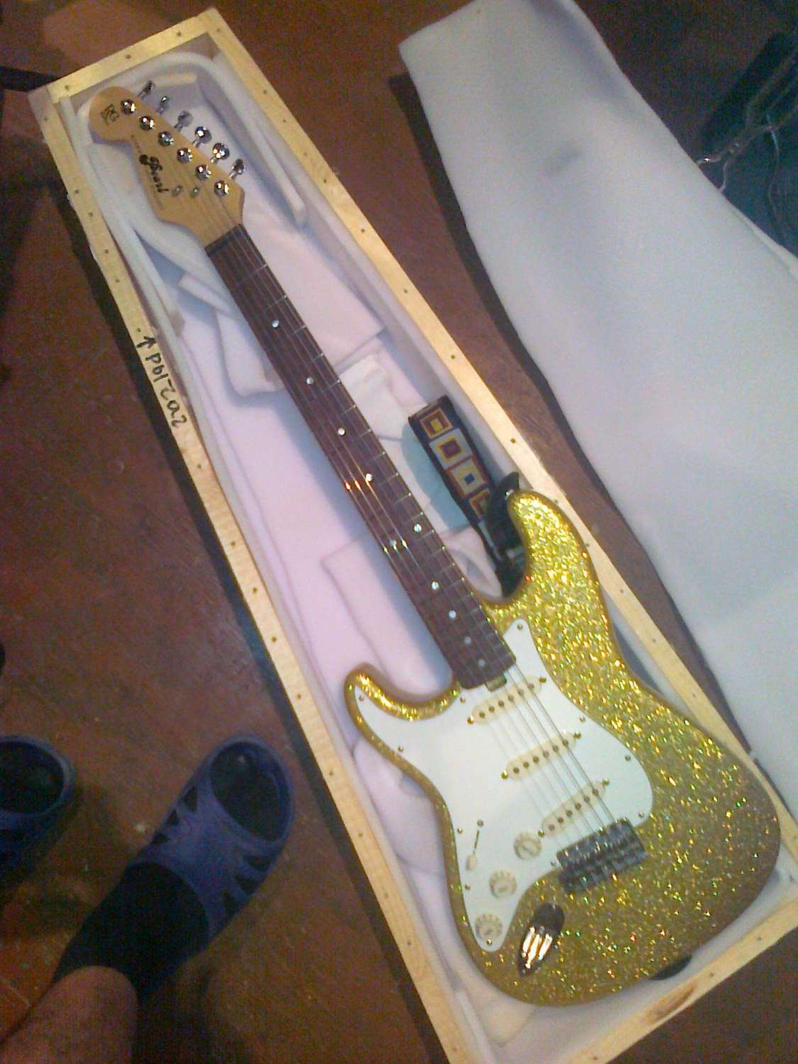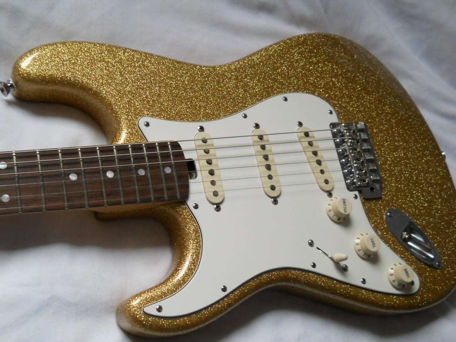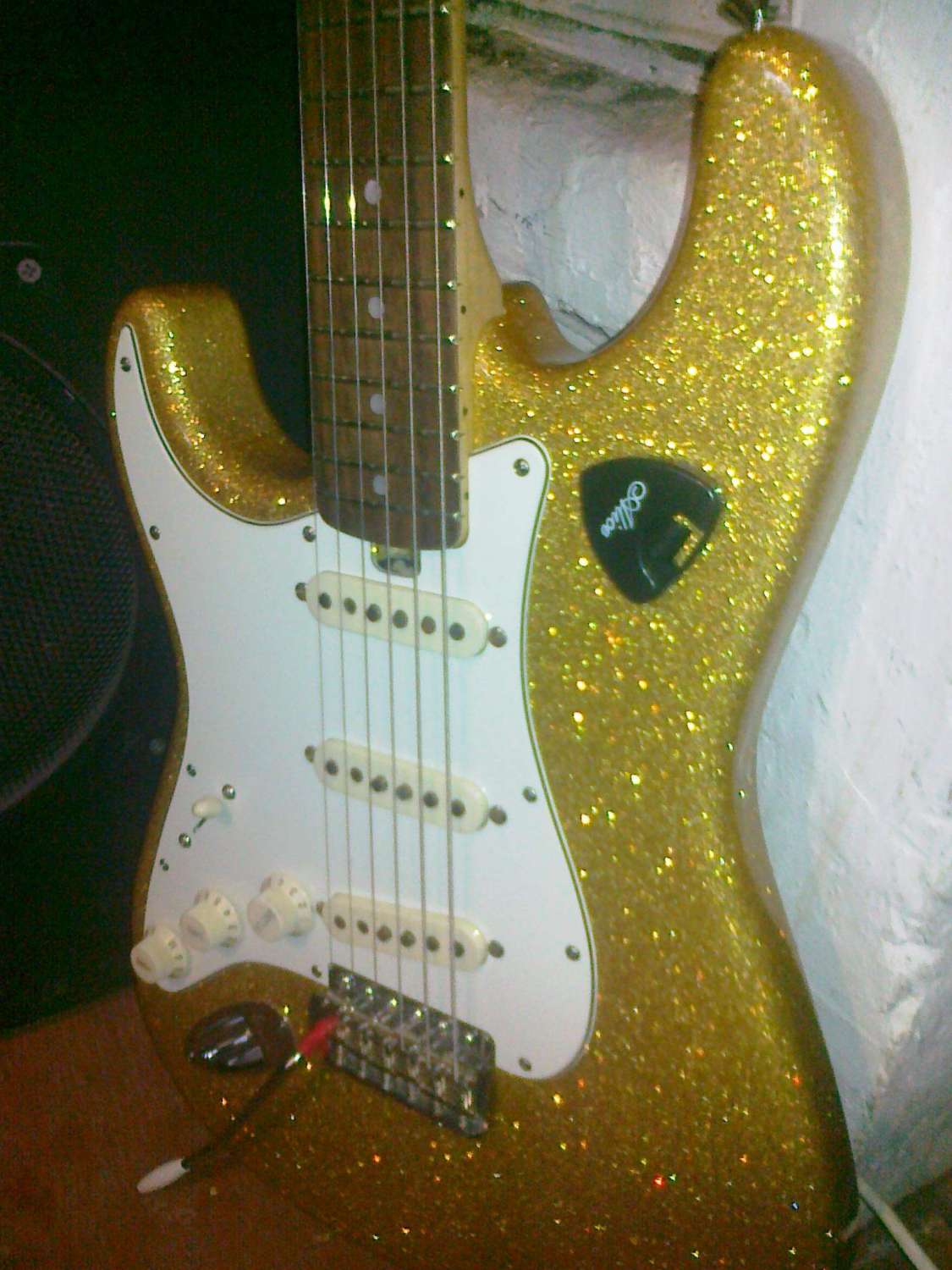 в меру классический ольховый страт, с оригинальной окраской золотыми блёстками, которая Роману удалась весьма близко к оригиналу (Дикдейловскому) с приятным налетом винтажности и вполне рабочими свойствами. Без претьензий
