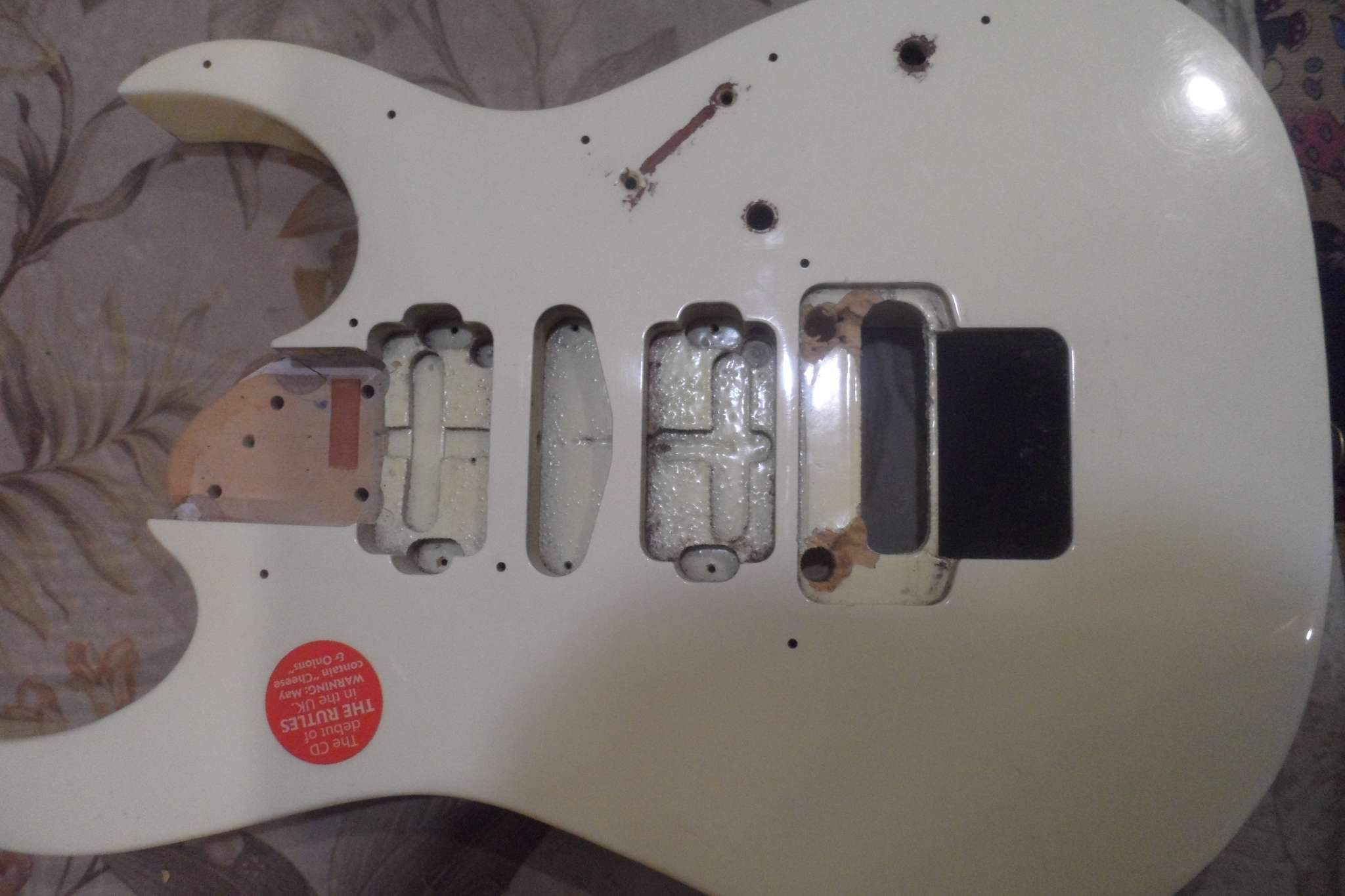 через почти 30 лет использования износился флойд Такеучи,который я решил поменять на GOTOH 1996t.. а втулочки там больше отверстий от родного флойда,пришлось рассверливать.. когда начал сверлить вместо ожидаемой стружки полезла какая то шляпа очень напоминающая вату.. я честно говоря от японцев такого не ожидал,до этого времени полагая,что дека сделана из стандартной липы.. надо сказать,что на те времена и инструмент был не из дешевых ..