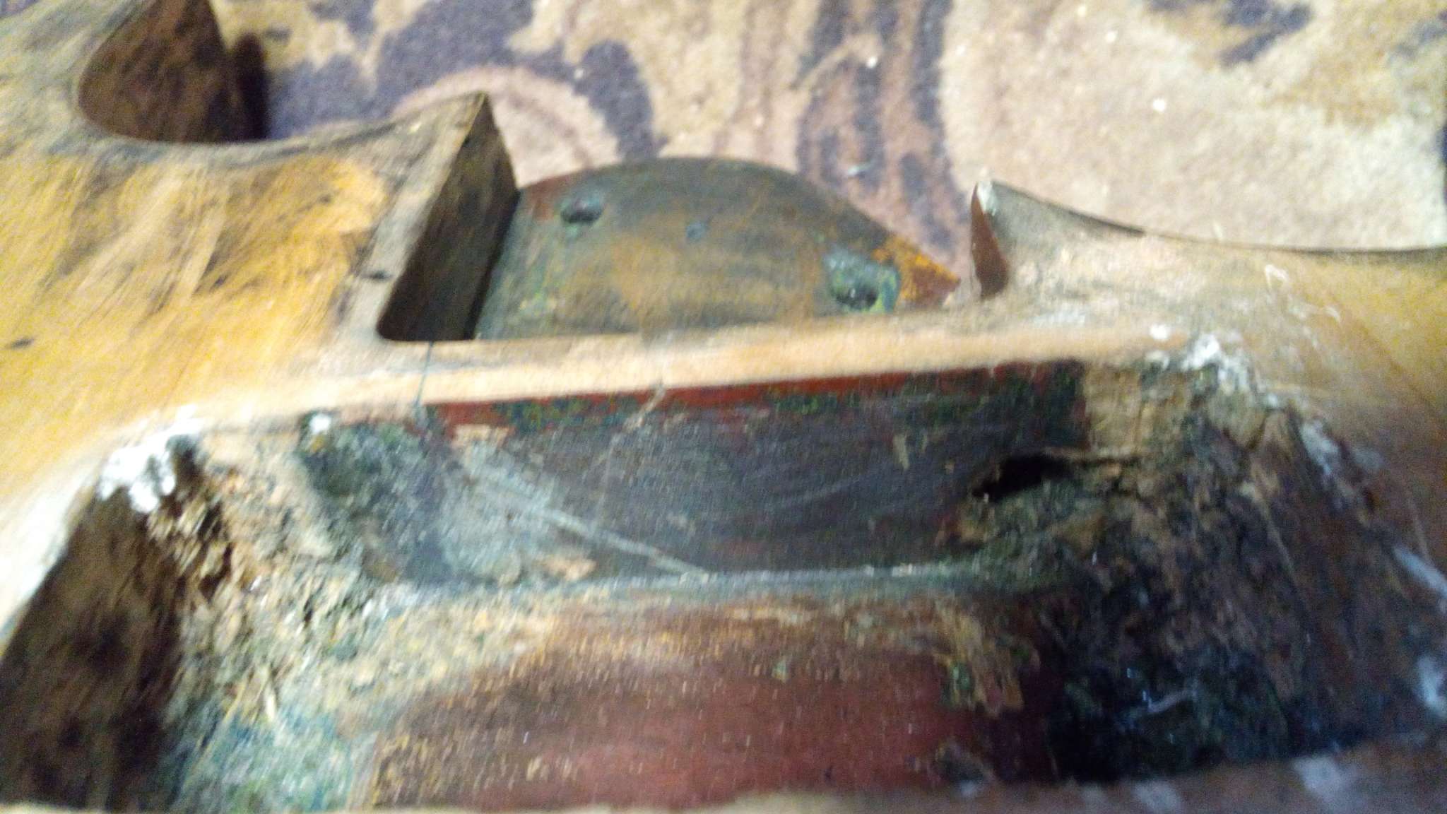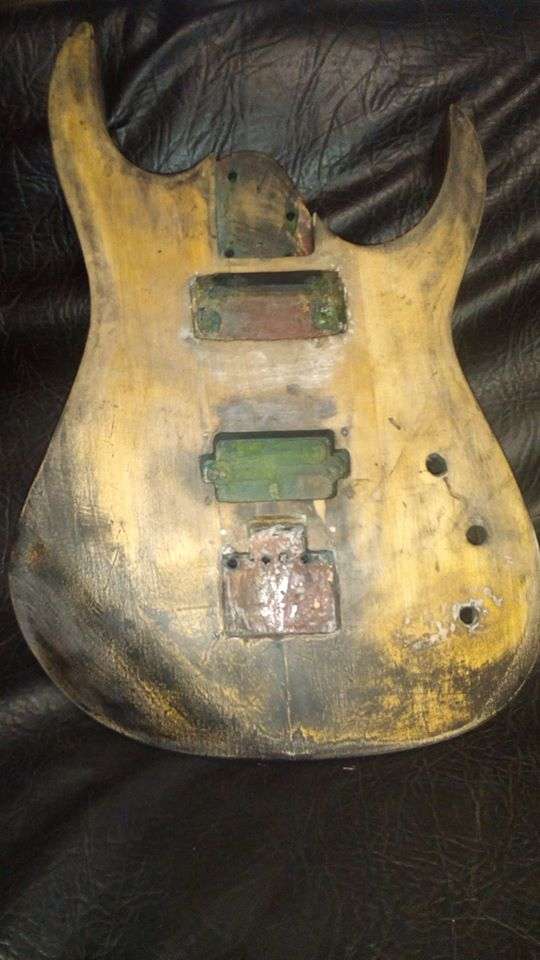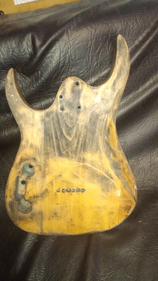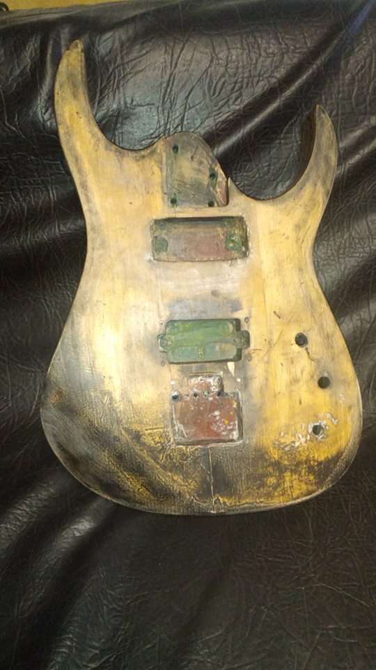 Есть дека формы суперстрат, приобрел за копейки с грифом с трех кусков, голова типичный Jackson, но не в грифе дело, продавец уверял что этот гриф не от этой деки, вырез под пятку 58 мм, гриф 56 мм. Перехожу к самому важному, на деке имеются странные оттиски в отверстиях звукоснимателей и вырезу под тремоло. Вырез под тремоло Kahler. Надписи очень плохо читаются так как дека красилась не один раз, нековое отверстие было заделано куском какого то стремного дерева и не аккуратно за шпатлевано. Эта надпись о которой идет речь состоит из нескольких полукругов, в которых 100% что то написано. На дырке под Kahler просто один полукруг с каким то словом. Кто то может подсказать что это вообще такое?