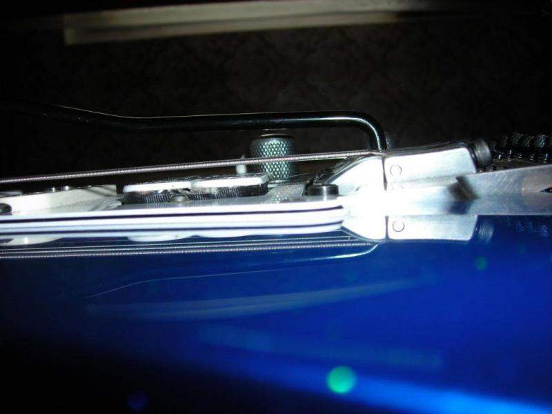 В нейтральном положении тремоло струны должны иметь максимальную высоту относительно деки, по сравнению с остальными положениями тремоло. У меня в результате рычаг оказывается параллелен деке - это грамотные люди специально так тремоло сконструировали.