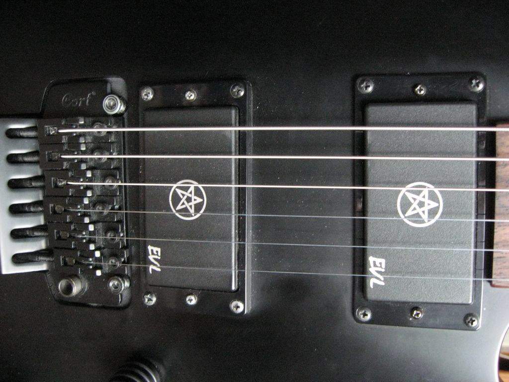 Этим и обратил на себя внимание. Чёрные точки почти не видны, из-за чего гриф издалека выглядит будто бы без инкрустаций, что придаёт крутости. Затёртая надпись Cort на голове грифа, металлическая крышка анкера с рисунком и форма головы выглядят обалденно. Корпус утончён к краям, что придаёт деке красивую форму и лёгкость. Пентаграммы ("звёзды пентагона" в кривом переводе) на звукоснимателях для блэкарей. Матовое покрытие стало глянцевым в местах касания руки с декой что и должно было произойти. В общем фломастеры.