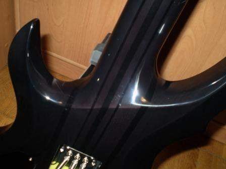 Внешний вид описать тяжело, надо смотреть. Форма специфическая, на любителя, но в целом гитара выглядит солидно. В гитаре превалируют два цвета черный, через который пробивается рисунок дерева, и никель. Цвет дерева меняется от зеленоватых до сиреневых оттенков в зависимости от освещения. На корпусе между «ушами» из ясеня идут 9 чередующихся светлых (клен) и темных (орех) полос сквозного грифа. Вся фурнитура сделана из никеля. Маркеры на ладах – элегантные перламутровые точки в верхней части ладов – подчеркивают черную лакированную накладку из эбони. Это было для меня существенным плюсом, та как не люблю обильную инкрустацию, когда от накладки ничего не остается. Просто красавица.