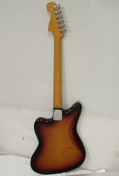 Итак, вернемся к собственно Fender Jazzmaster. Первое что было сделано - гитара была разобрана до последнего винтика, полностью снят полиуретановый лак с деки. Многие знают, что старая добрая нитра позволяет инструменту дышать и положительно влияет на звук, значительно тоньше полиуретана, а со временем, испаряясь, становится все тоньше и тоньше. Гриф полностью обдирать не стали чтобы сохранить логотип и номерной штамп инструмента. Дека была заново покрашена нитролаком в классический санберст, после чего была состарена. Соответственно, все железки, ручки и тд -тоже. Результат запечатлил на фото.
