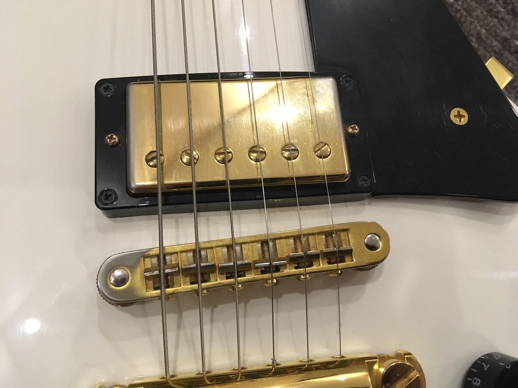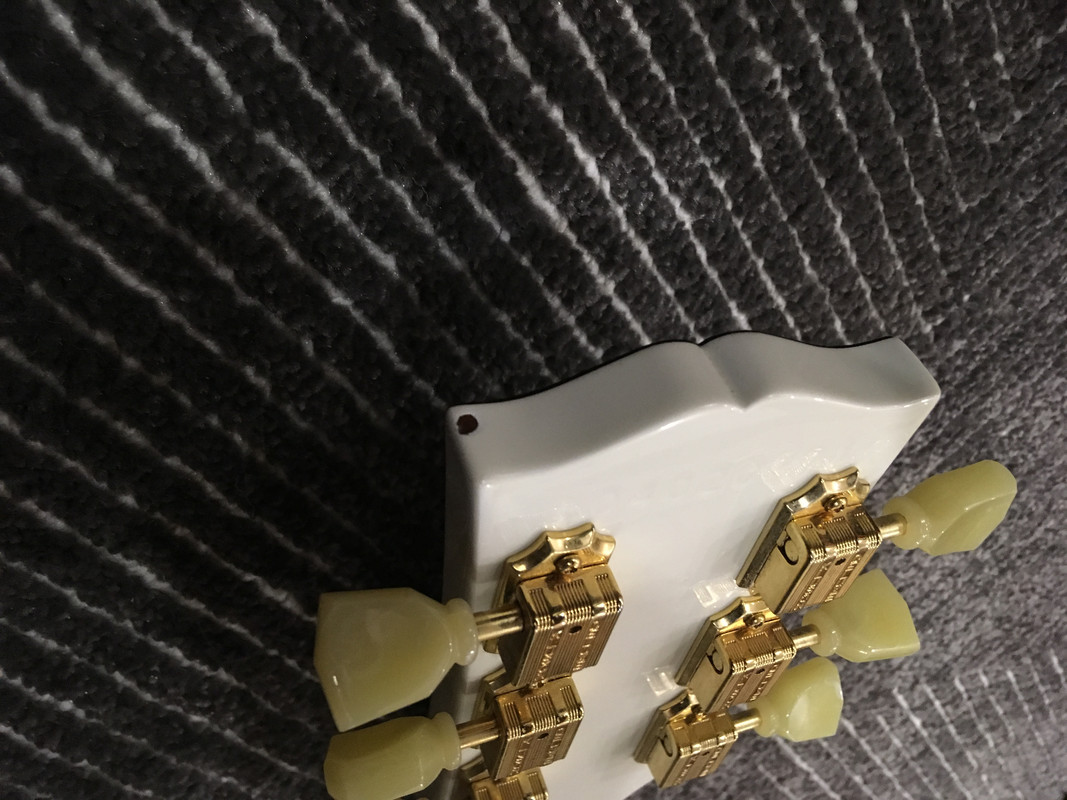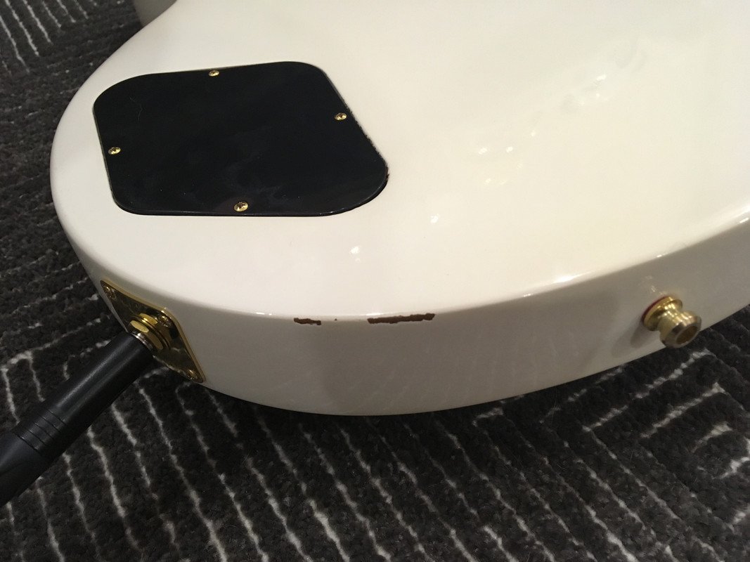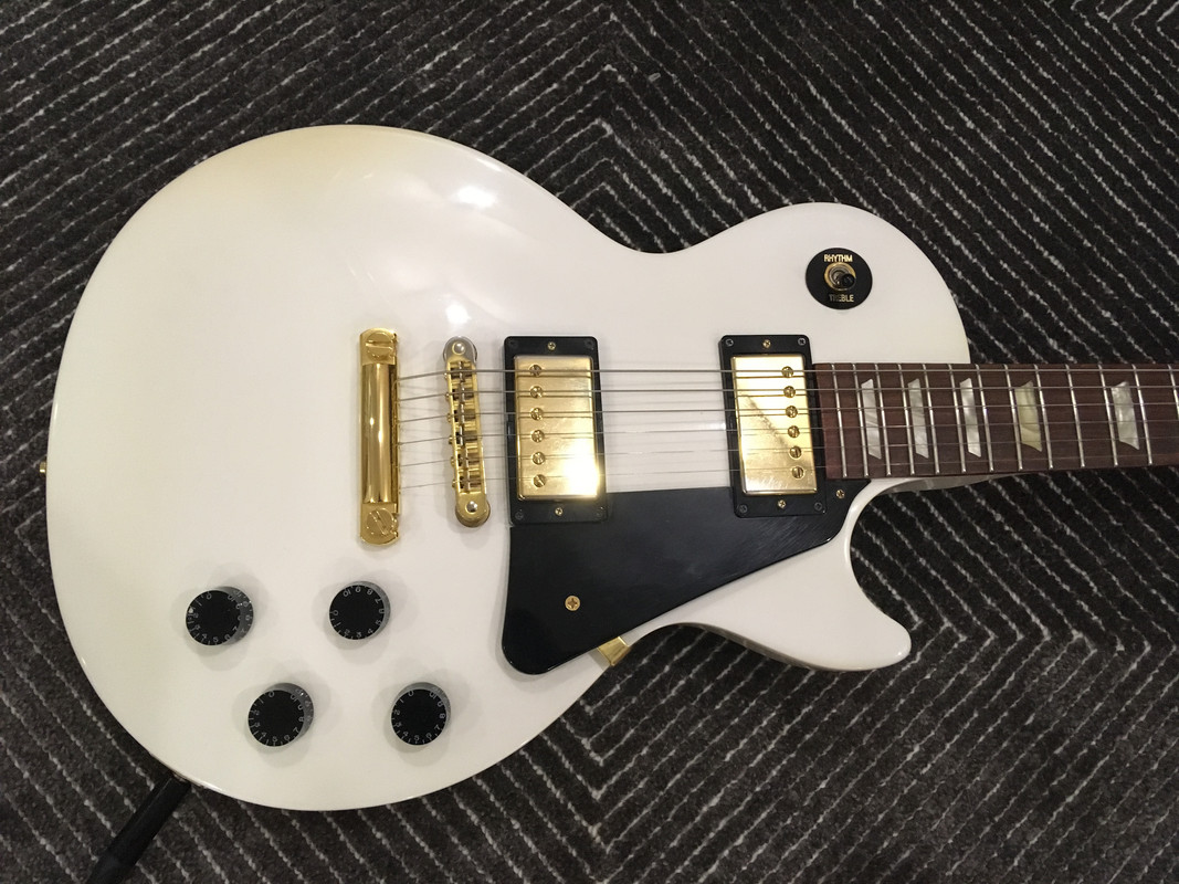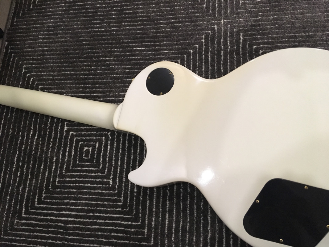 Orville by Gibson Les Paul Custom, на котором невозможно было играть в силу его огромного веса захотелось мне вновь поиграть соло Гари Мура. Подвернулся по хорошей цене абсолютно новый Gibson Les Paul Studio 2012 Alpine White с оригинальным кейсом и со всеми бумажками. Да еще и на вопрос о весе инструмента был получен ответ о фантастических 3,3 кг - меньше, чем стратокастер или телекастер, с характерными для них 3,5 кг. Так он и оказался у меня.