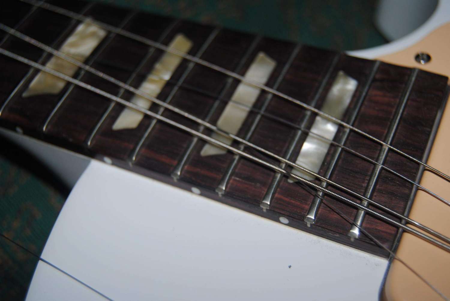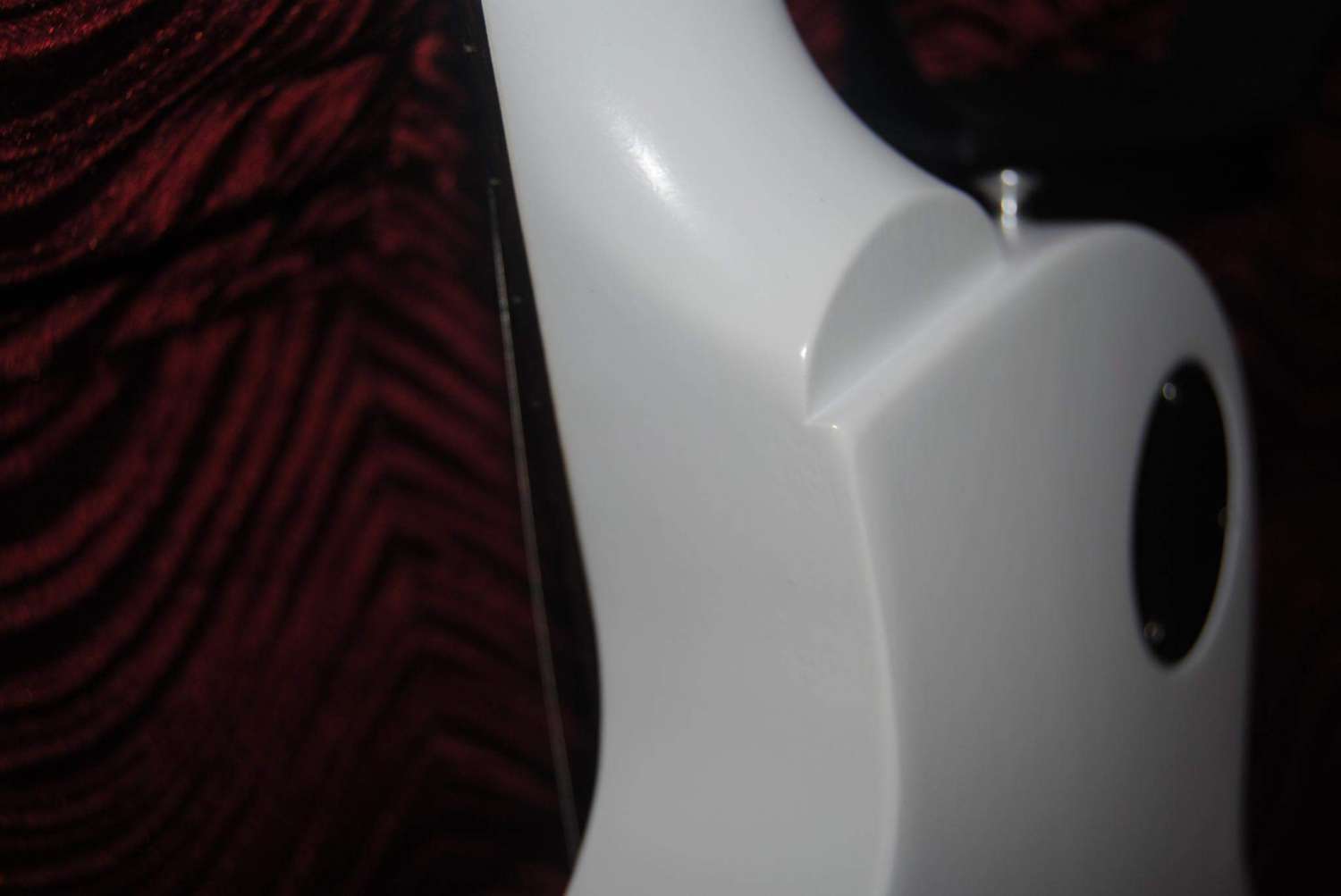 Гитара с кленовой накладкой оказалась лучше загрунтована заполнителем пор и очень хорошо покрашена ( без наплыво, трещин и пятен) - по сути это был белый ровный цвет, чуть глянцевый, просто без прозрачного лака поверх как на стандарде. В паре мест сделаны аккуратные затертости по грани - виден клен и виден махагон. Из косяков - на грифе чернила сиреневые - видно штампы ставили в бумажки и задели, или ручкой. Большой косяк - вдоль каждого лада след от закатки, как царапина паралельно ладу. Лады округлые, края неплохие, ничего не царапает.
