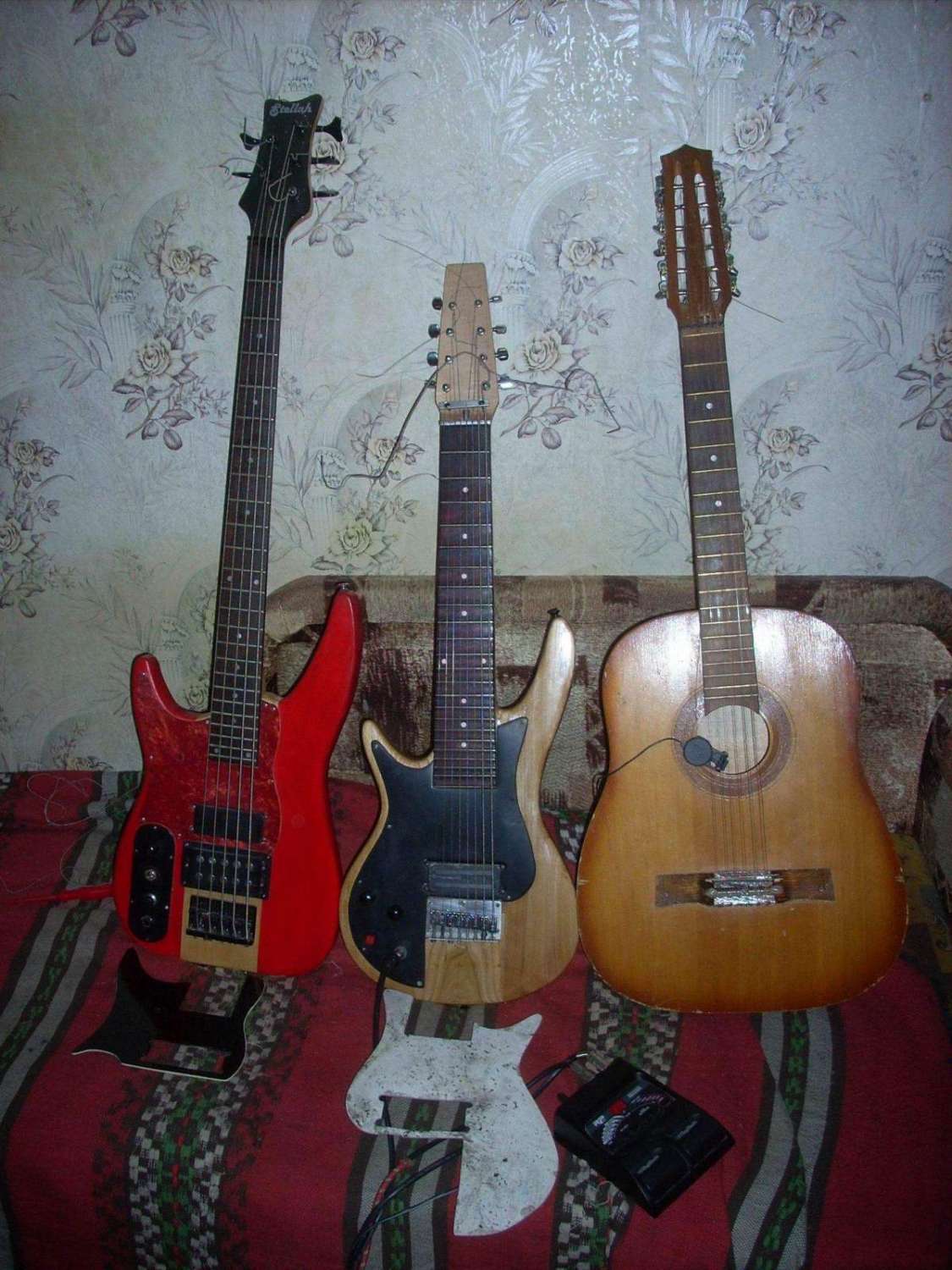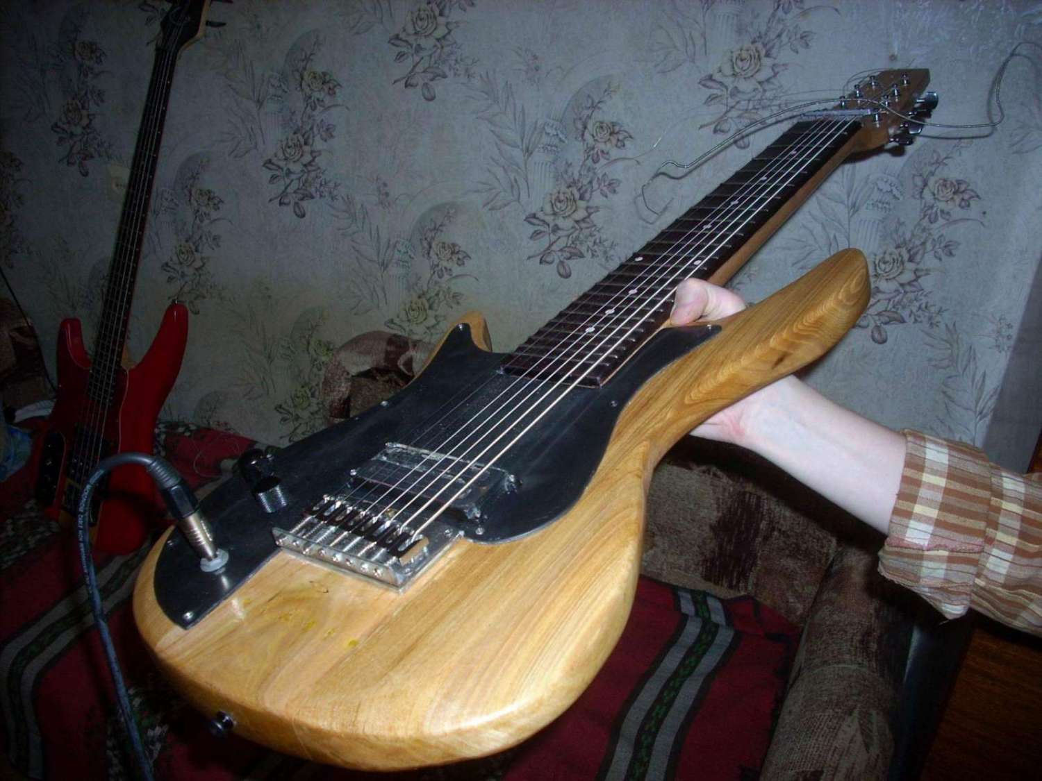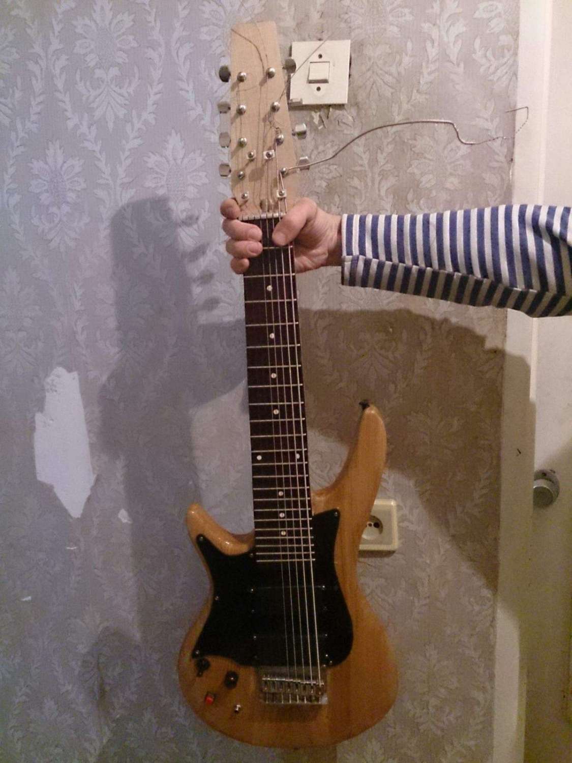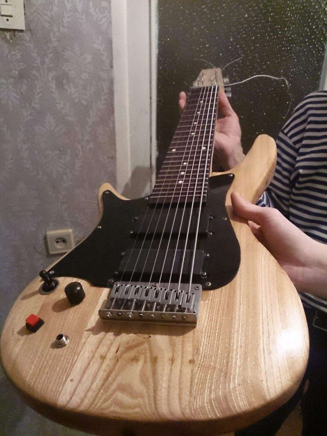 Ну так вот! ...звучок с баса несмотря на мое опасение по счет неправильной частотки звука для гитары дал на удивление чистый звук, после установки отсечки кристальность верхних частот которым видно поспособствовал гриф из клена с кленовой же накладкой которую я заморил просто от необходимости( при склейке клей выдавился и впитался по бокам грифа черными не выводимыми пятнышками) в общем ''Фендер'' в Ближайшее будущее мне уж точно не нужен! я как мне кажется получил предельно открытый и очень сильный звук вплотную приблизивший меня к серьезным ''стратообразным'' гитарам, при чем звук очень похож на переделанный ''Грег-Беннет'' оснащенный кленовым топом но cовершенно лишенный странных биений и призвуков которые вылазиют при его записи но все хорошо не бывает и новая гитара фонит очень сильно на отсечке и при перегрузе и в режиме хамбакера(как видно это неизбежность звукоснимателей с разделенной схемой+ тут еще аж ДВА магнита -причем сверху как рельсы!