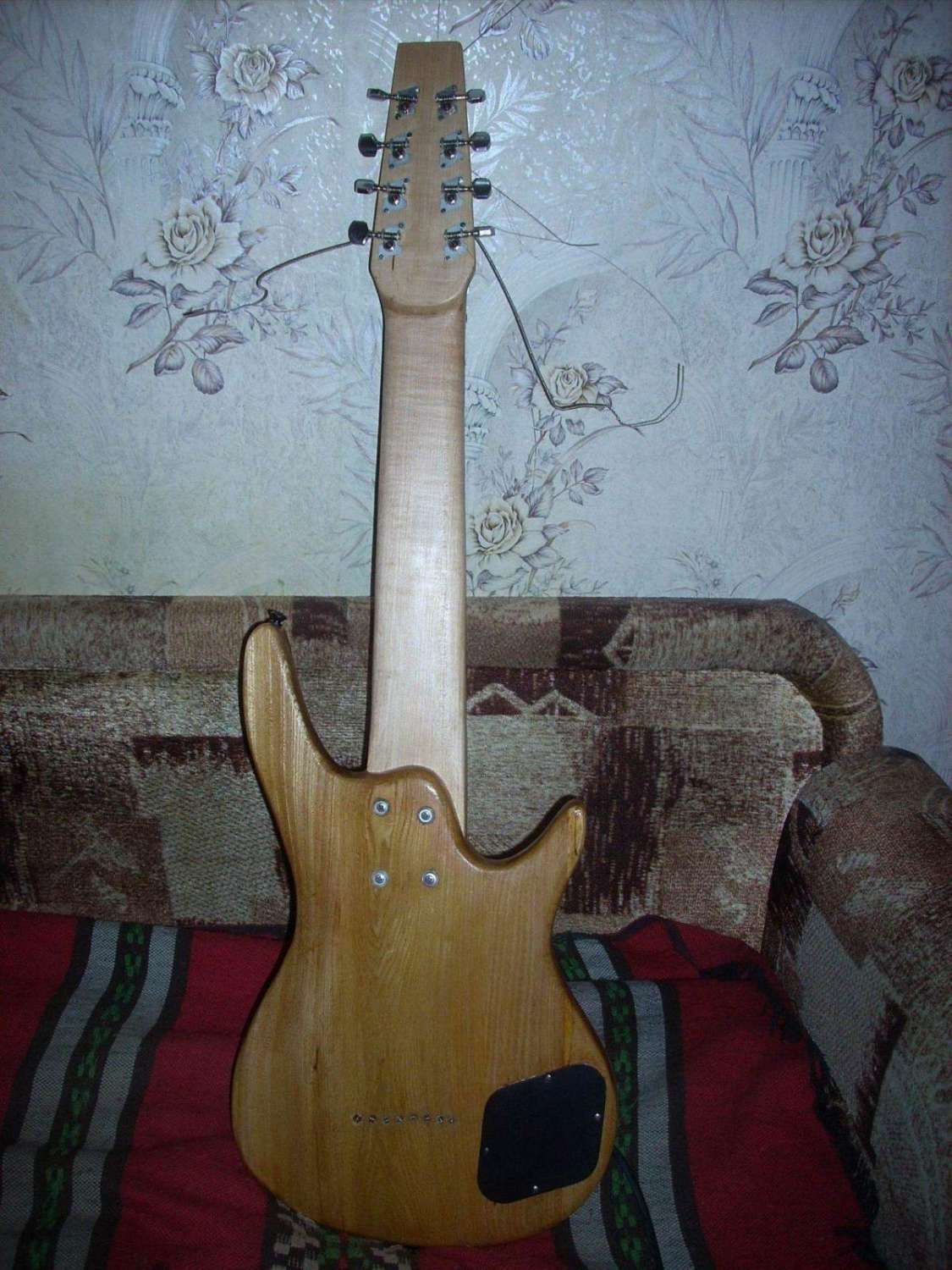 ) На счет нового корпуса после раздумий решил не заморачиваться и поскольку вообще вся затея изначально чистая авантюра решил использовать корпус пресловутого баса Stellah и его один звучок который по длине как-раз тютелька в тютельку миллиметр в миллиметр и ни одного лишнего подходил под восемь струн и стандартной ширины бридж , с корпусом я нажил глобальные проблемы по его подгонке, свой запилить было бы как оказалось в разы проще